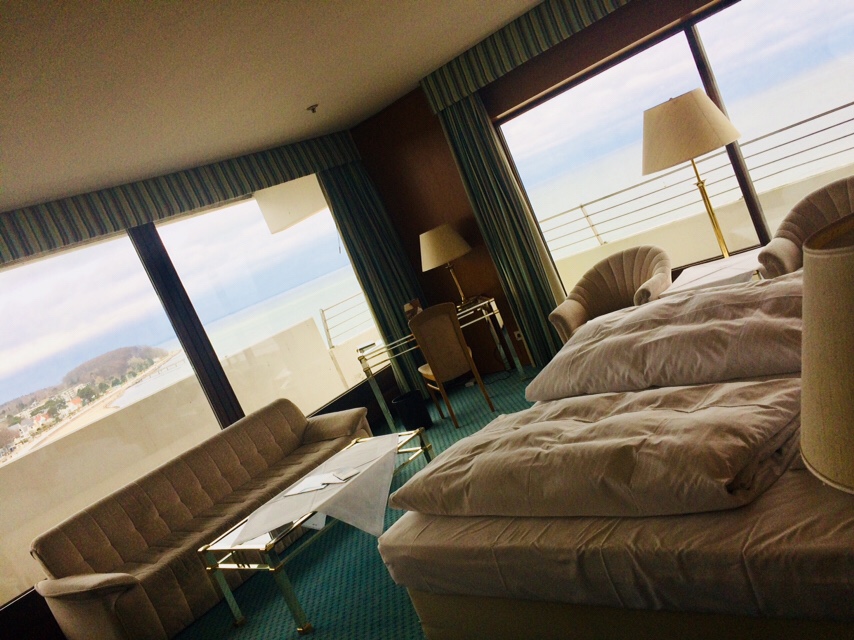 Die Tagesplanung verzögert sich. Ich kann zwar schon um 12.00h einchecken, bin aber so angetan von meinem Hotelzimmer, dass ich nicht auspacke, sondern eine halbe Stunde auf- und abwandere. Die haben sich vertan bei der Zimmervergabe, denke ich. Das ist ein grandioses Upgrade auf eine Eck-Suite mit Sofa, Sesseln, Ankleidezimmer, Tischen, riesigen Fensterfronten, um die eine Terrasse läuft und einen direkten Blick über die Bucht von Travemünde freigibt.