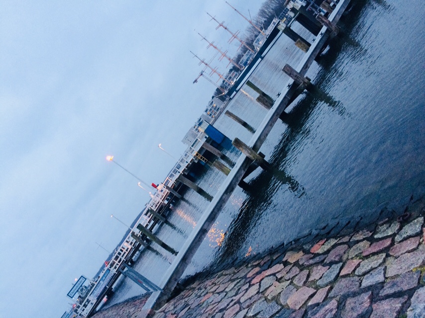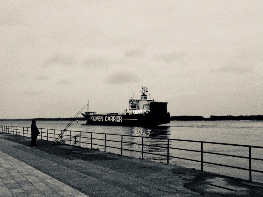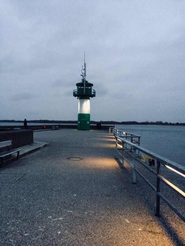 Auf dem Weg zum Leuchtturm fängt es an zu schneien. Nur ein paar kleine Flocken, die sich in die ruhige Szenerie einfügen. Die Wellen plätschern sachte an den Strand, Enten picken in den angespülten Algen, eine Ratte huscht über die glitschigen Steine. Was für ein Unterschied zu den wütenden Wellen auf Sylt, dem Sturm und dem Regen. Es ist so friedlich, denke ich, und schaue wieder auf die Bucht, die jetzt im Dunkeln liegt. Ein Schiff läuft aus und schiebt sich langsam am Leuchtturm vorbei. Ein Angler wartet geduldig auf einen Fang.