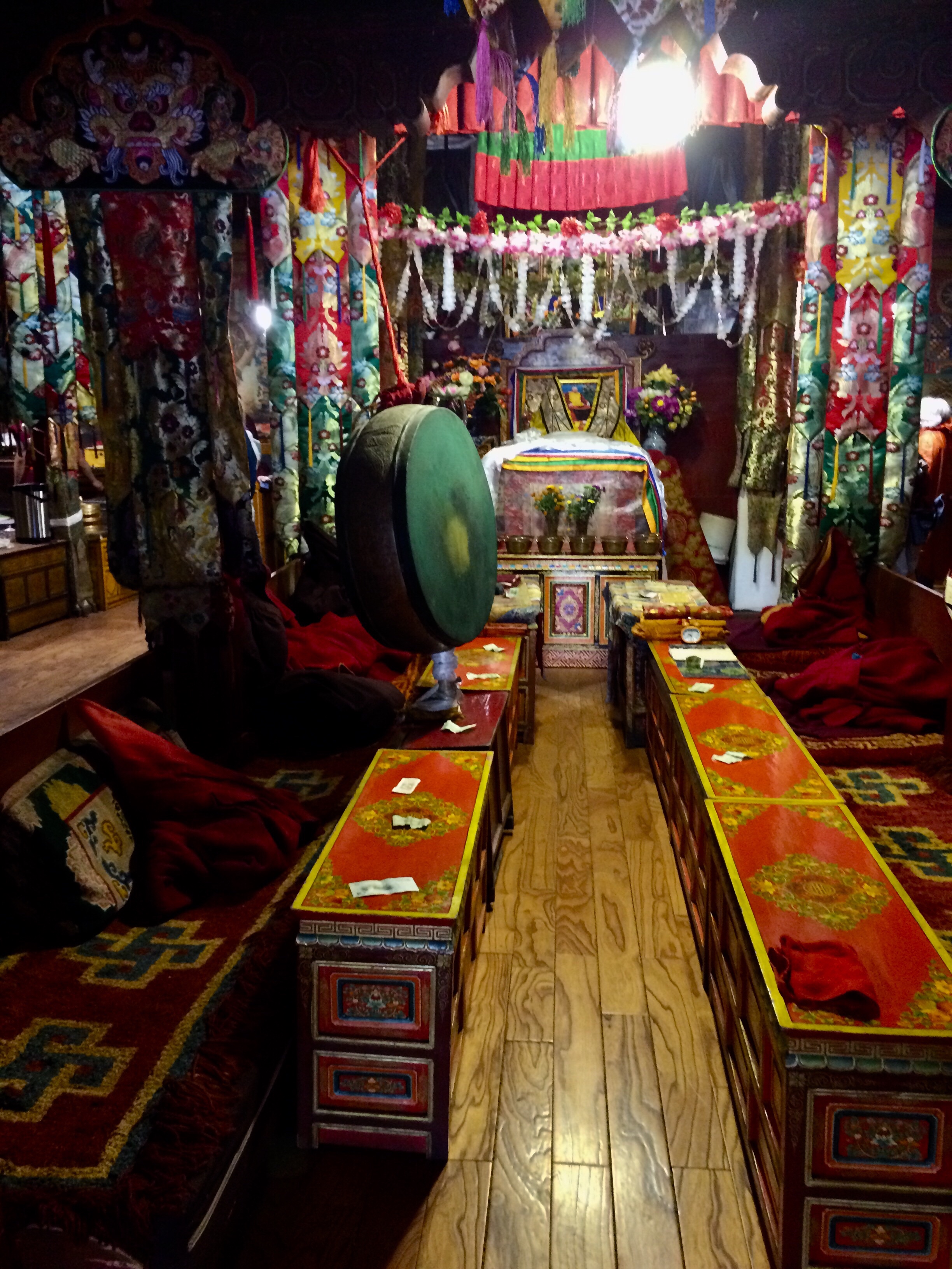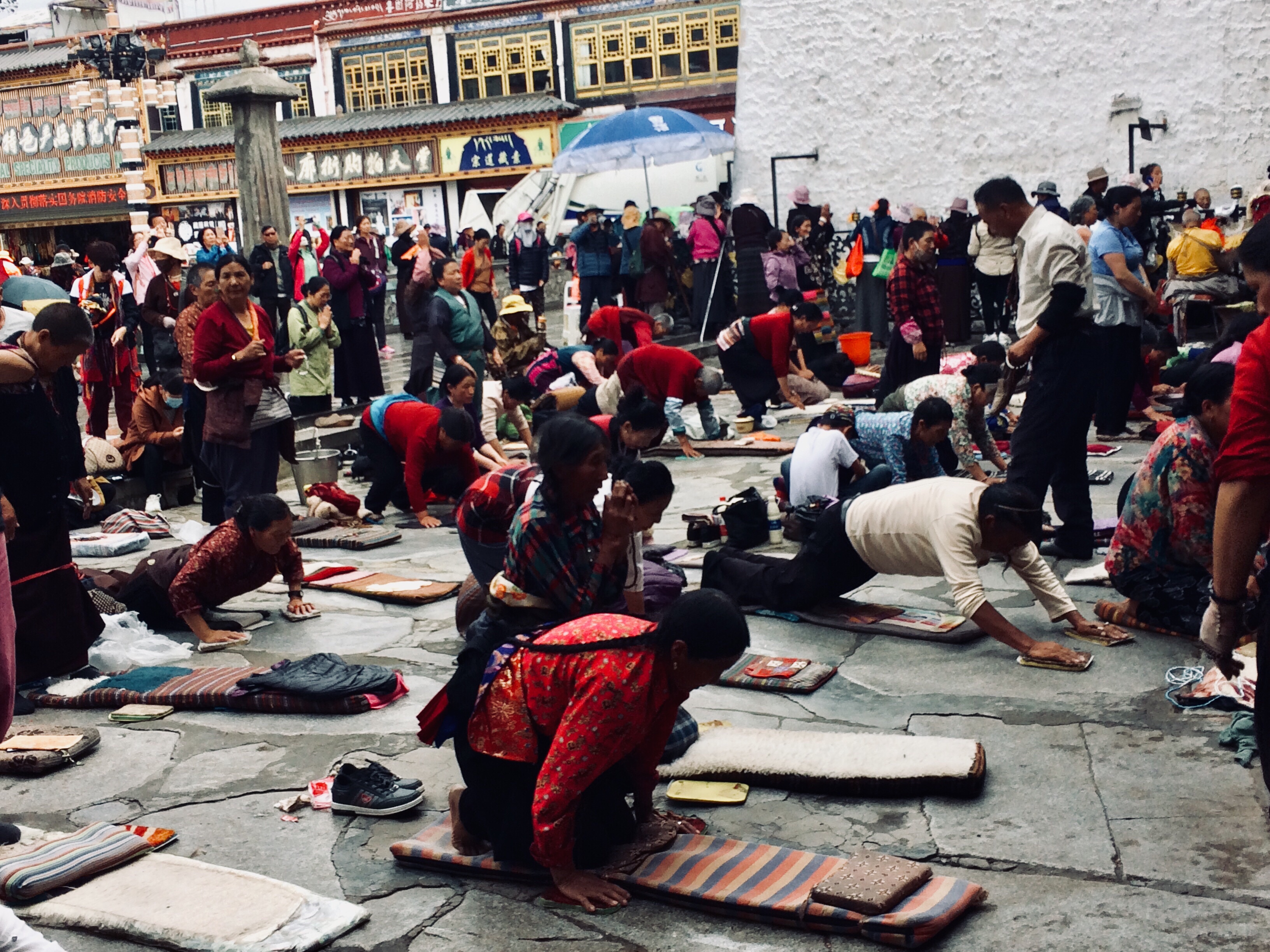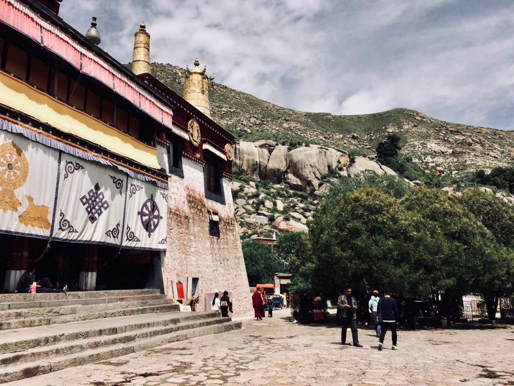 Nach dem Frühstück (es gibt sogar Bananen, Apfel, Haferflocken und Yoghurt) machen wir uns auf den Weg zum Barkhormarkt, wo es Gebetsmühlen, Klangschalen, Räucherwerk, Schals, Öl und Buttertee gibt – eben alles, was man als Pilger braucht. Wir umrunden mit ihnen den Jokhang-Tempel, das wichtigste Heiligtum in Lhasa. Im Tempel ist es heiss und stickig, es riecht nach Öl und dem Butterzeug, was die Pilger an den Buddha-Statuen spenden, und davon gibt es viele. Dicht gedrängt steigen wir die Stufen hinauf auf’s Dach und haben einen wunderschönen Blick auf die Umgebung. Wir besuchen zwei weitere Tempel, auch hier dominieren Gedrängel, intensive Gerüche, die sonoren Stimmen der Betenden, die riesigen Statuen und die intensiven Farben und bunten Holzverzierungen. Der dumpfe Klang der Trommeln, der die bösen Geister vertreiben soll, unterstreicht diese fremde Welt.
