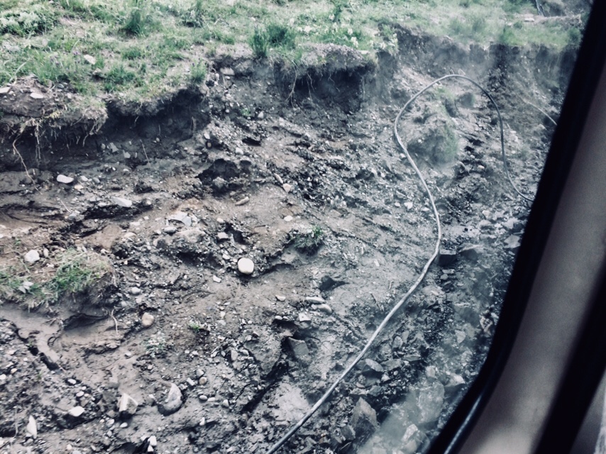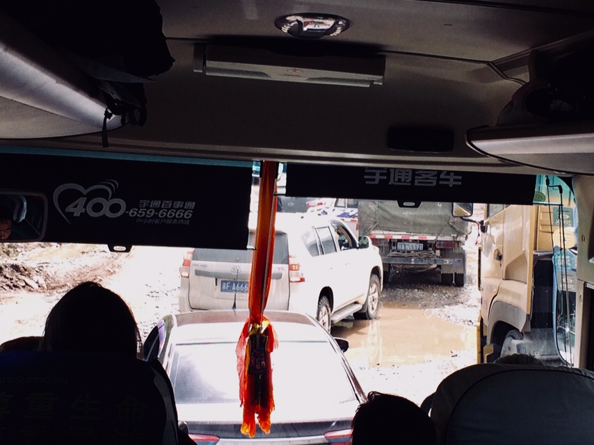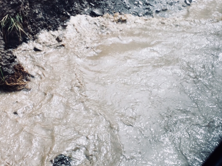 Dann ein abruptes Ende: vor uns ist die Straße weggesackt und überflutet. Links die Felsen, aus denen Baufahrzeuge Stücke reißen um damit die Straße aufzuschütten, rechts der reißende Fluss, der die Straße in Besitz nehmen will. Etliche Wagen, Laster, Baufahrzeuge vor- und hinter uns, die im Schlamm steckenbleiben und versinken. Es herrscht Chaos.