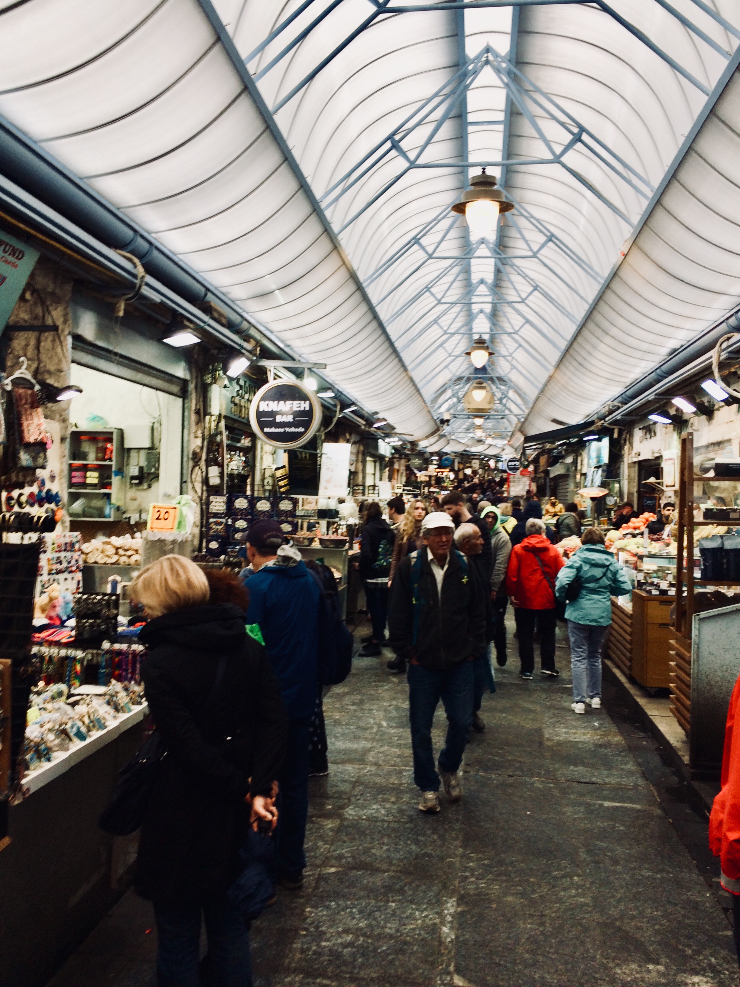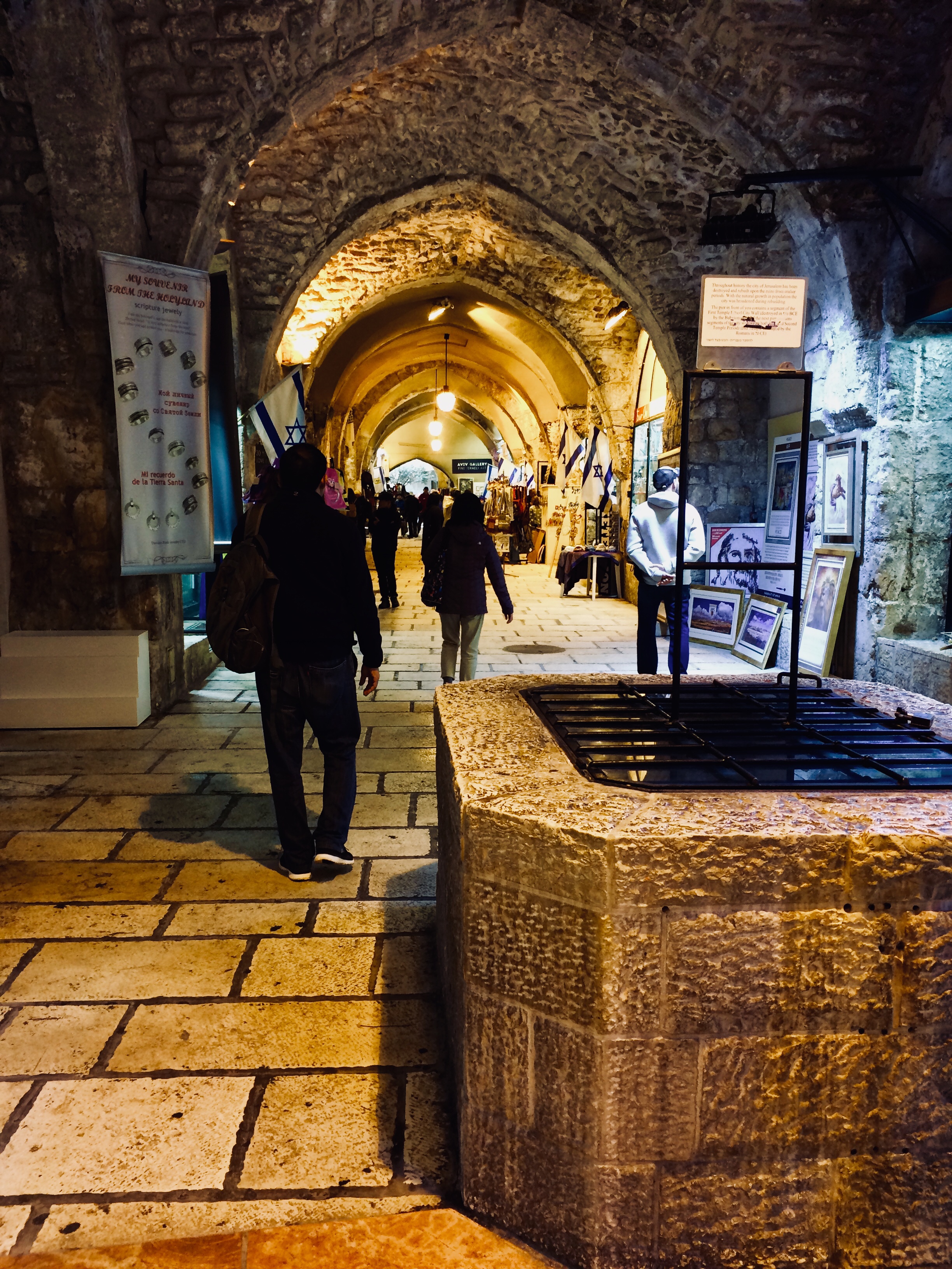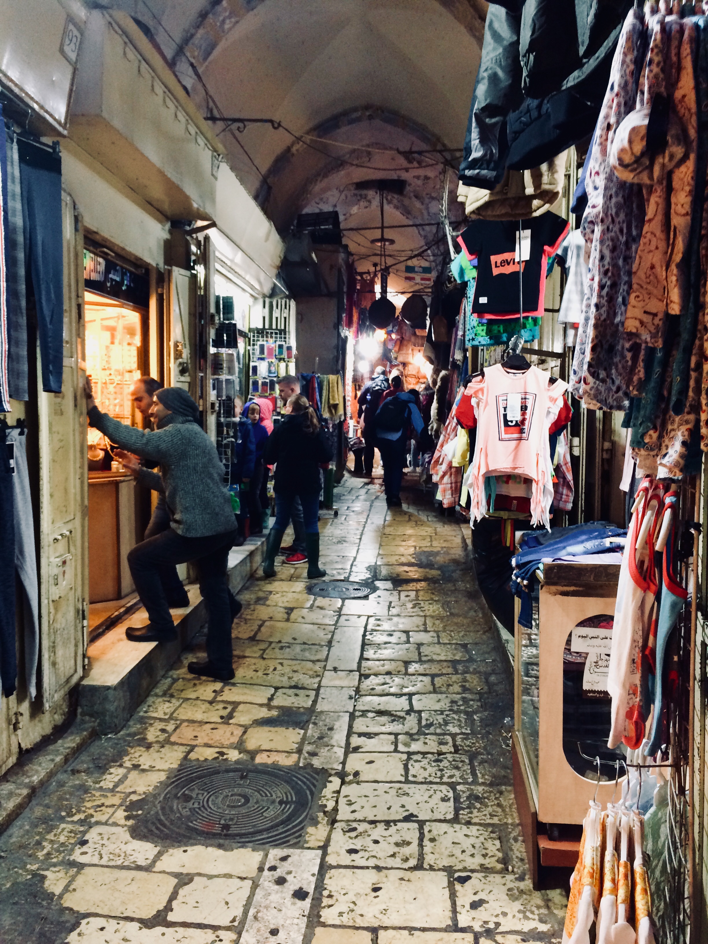 Auf dem Mahane-Yehuda-Markt kaufen wir Gewürze, Nüsse und Brot, danach ist Freizeit. A., S., K. und ich nehmen das Damaskustor in die Altstadt, wir schlendern nochmal durch das arabische Viertel und den Bazar, der abrupt endet und in den jüdischen Teil übergeht. Eine unsichtbare Grenze trennt das laute Treiben der überfüllten Stände mit Schals, Früchten, Schuhen, Gewürzen, Tees und Schüsseln von Kunsthandel und edlen Silbergeschäften auf der anderen Seite.