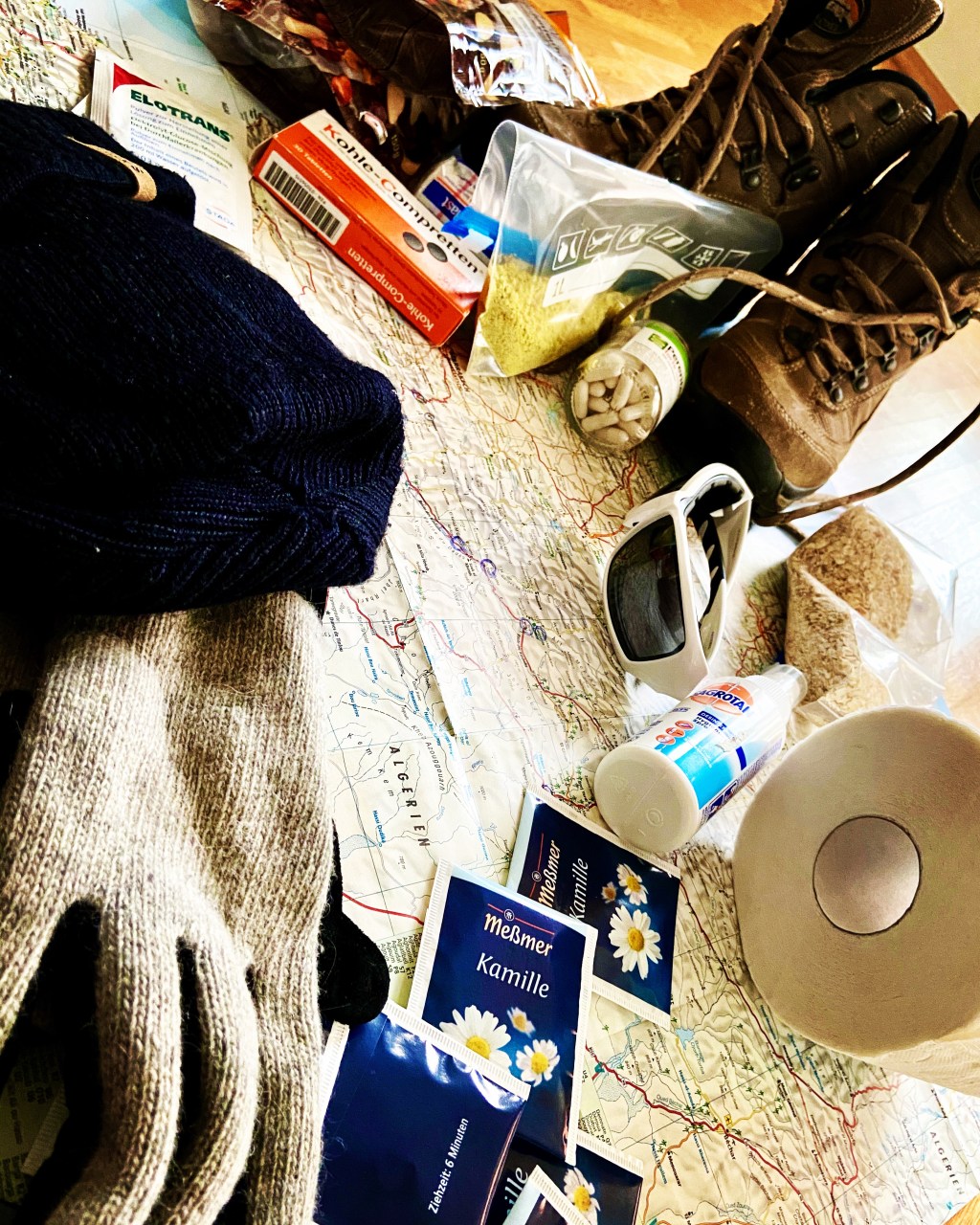 Kamillentee, Klopapier, Desinfektionsmittel, Kohle-Kompretten, Trockenhefe, Verbandszeug, Elektrolyte, Haferflocken, Gemüsebrühe, Nüsse, Wanderstiefel, Mütze, Handschuhe, Sonnenbrille…