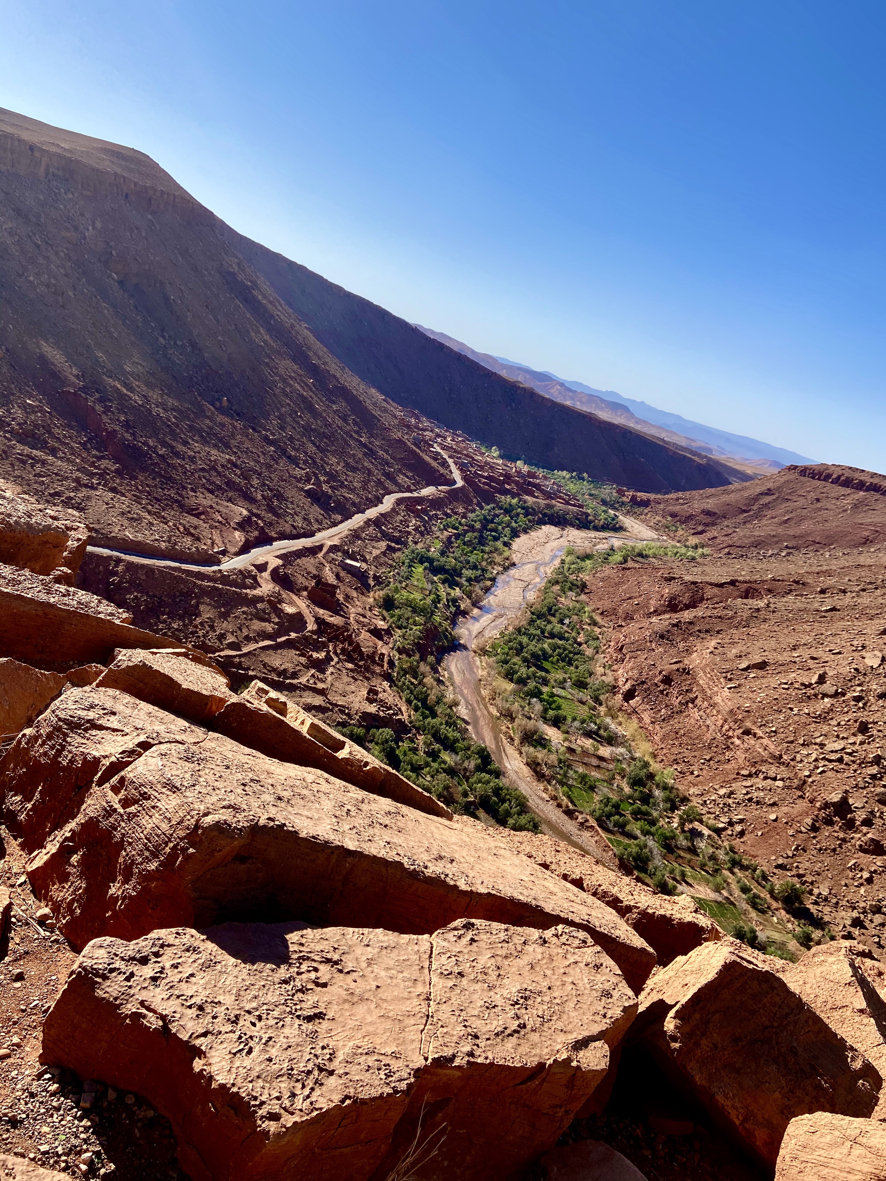 Schau, die Berge, der rote Stein, die gelben Felsen, die grünen Flanken. Und schau, da leuchtet der Schnee, ganz oben. Schau, die Palmen und die saftigen Wiesen bei der Kasbah, die lehmerbaute Burg von einst und von heute. Schau, die Sonne, wie sie wärmt, und schau, wie blau der Himmel leuchtet. Schau, die Kasbah Telouet, der einstige Palast des Paschas von Marrakesch, in dem Feiern mit tausenden Gästen stattfanden, mit Champagner, der den Hügel hinaufgebracht wurde. Schau, wie der Palast verfällt. Und schau dort, die Kinder, die Fussball spielen, die Frauen, die verhüllt vor ihrer Lehmhütte sitzen, und schau da, die Kuh und das Huhn. Schau, die Armut.