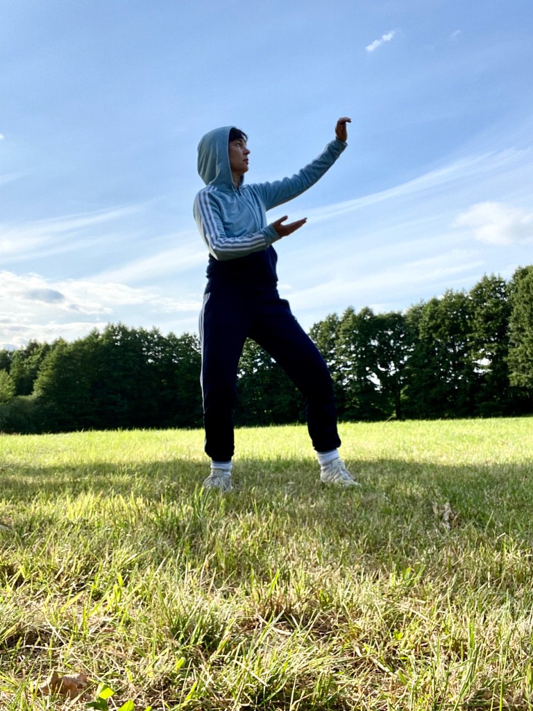 Ich mag es, auf der Wiese zu stehen und den Worten meines Lehrers zu folgen, der auch die Nachmittagseinheit mit einer Meditation einleitet, die uns darauf fokussiert, wo wir sind: im hier und jetzt. Auf einer grünen Wiese, umgeben von rauschenden Bäumen, summenden, brummenden und zirpenden Insekten. In der Nähe klopft ein Specht.