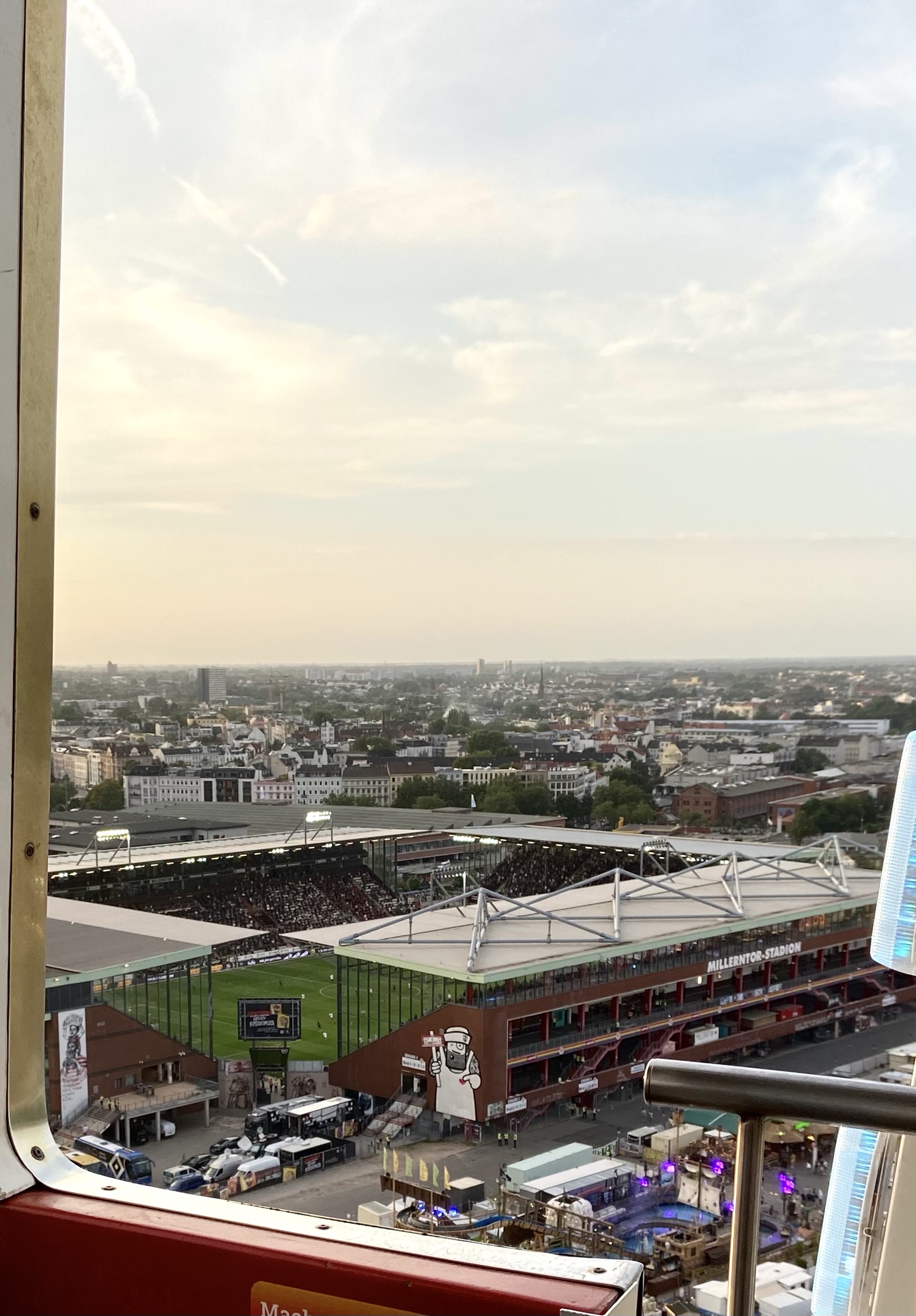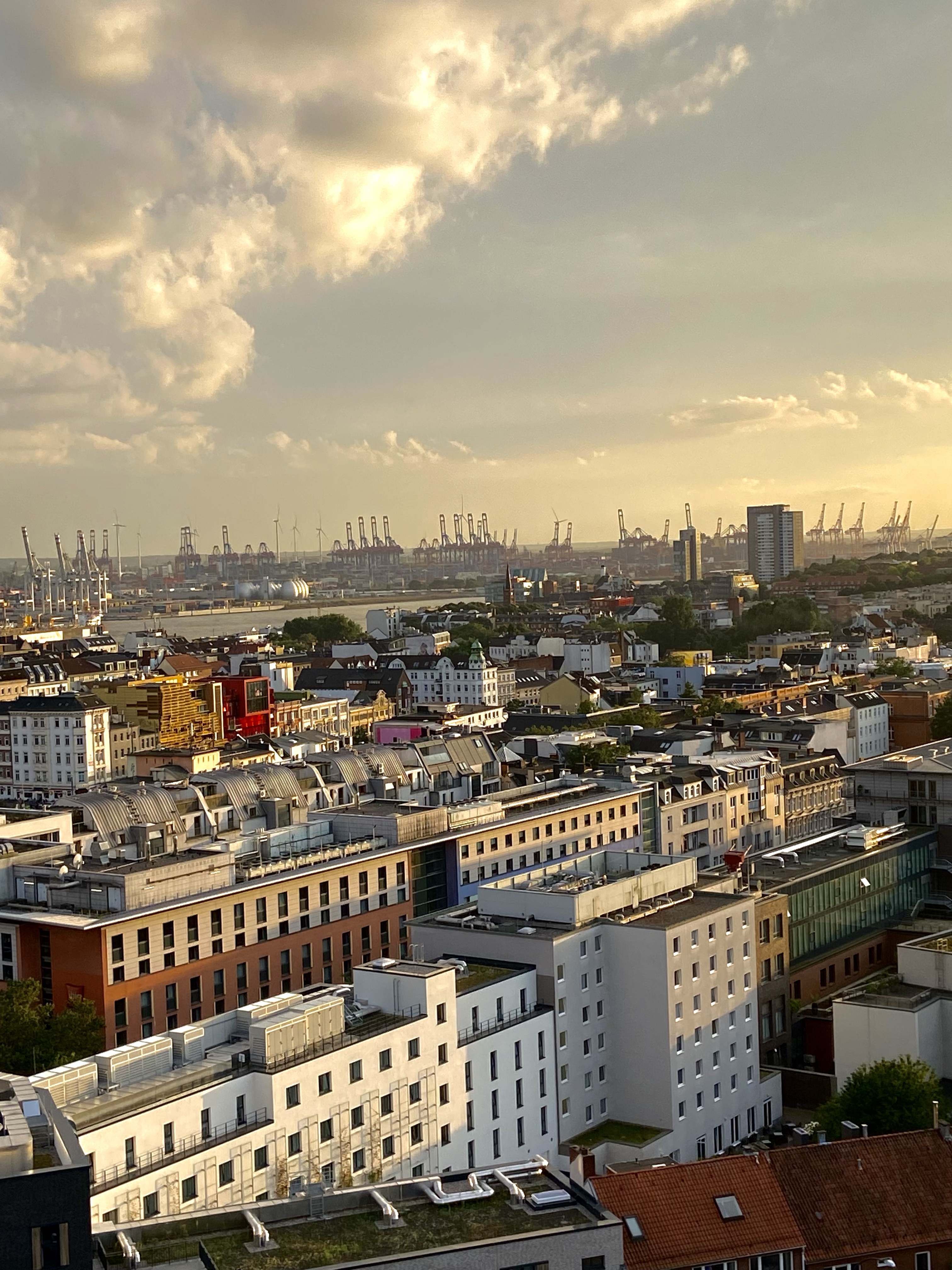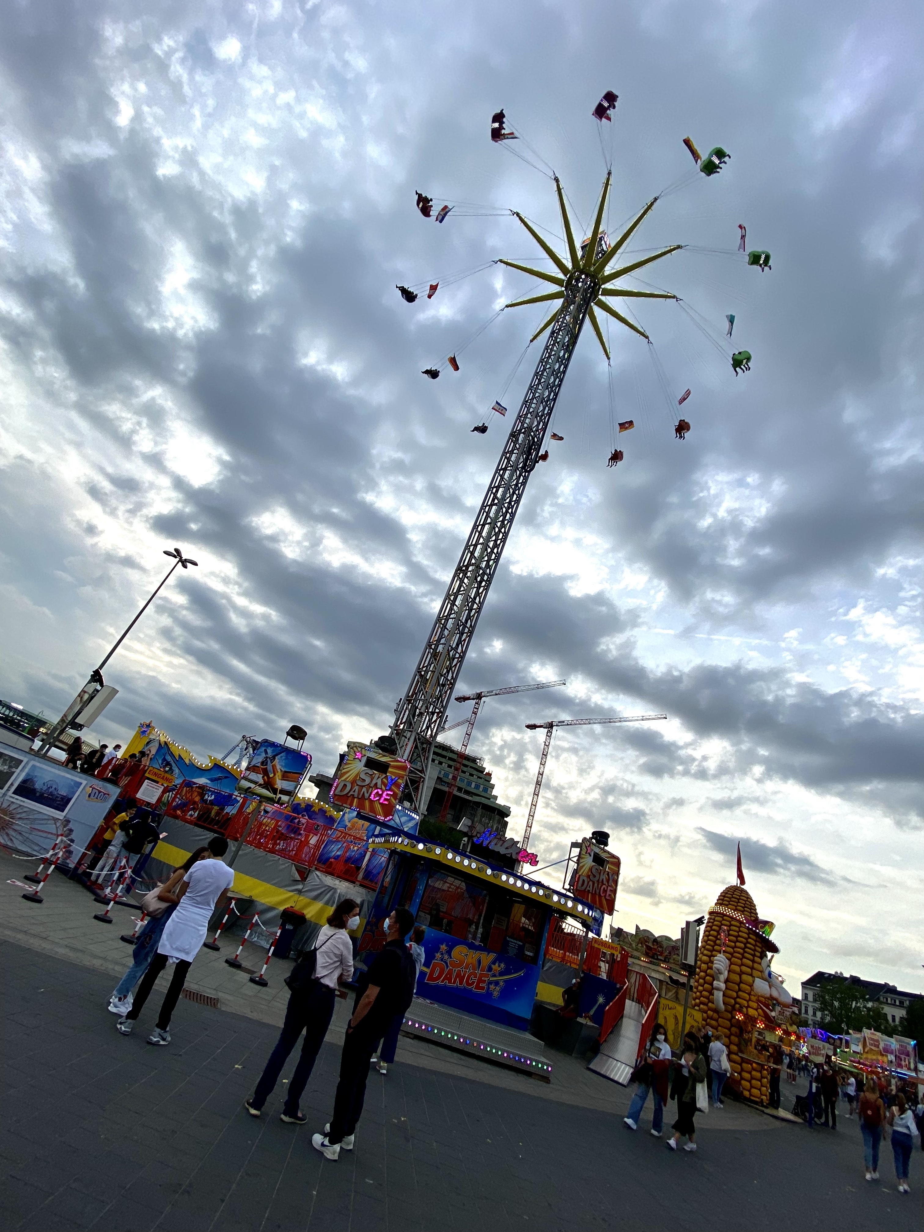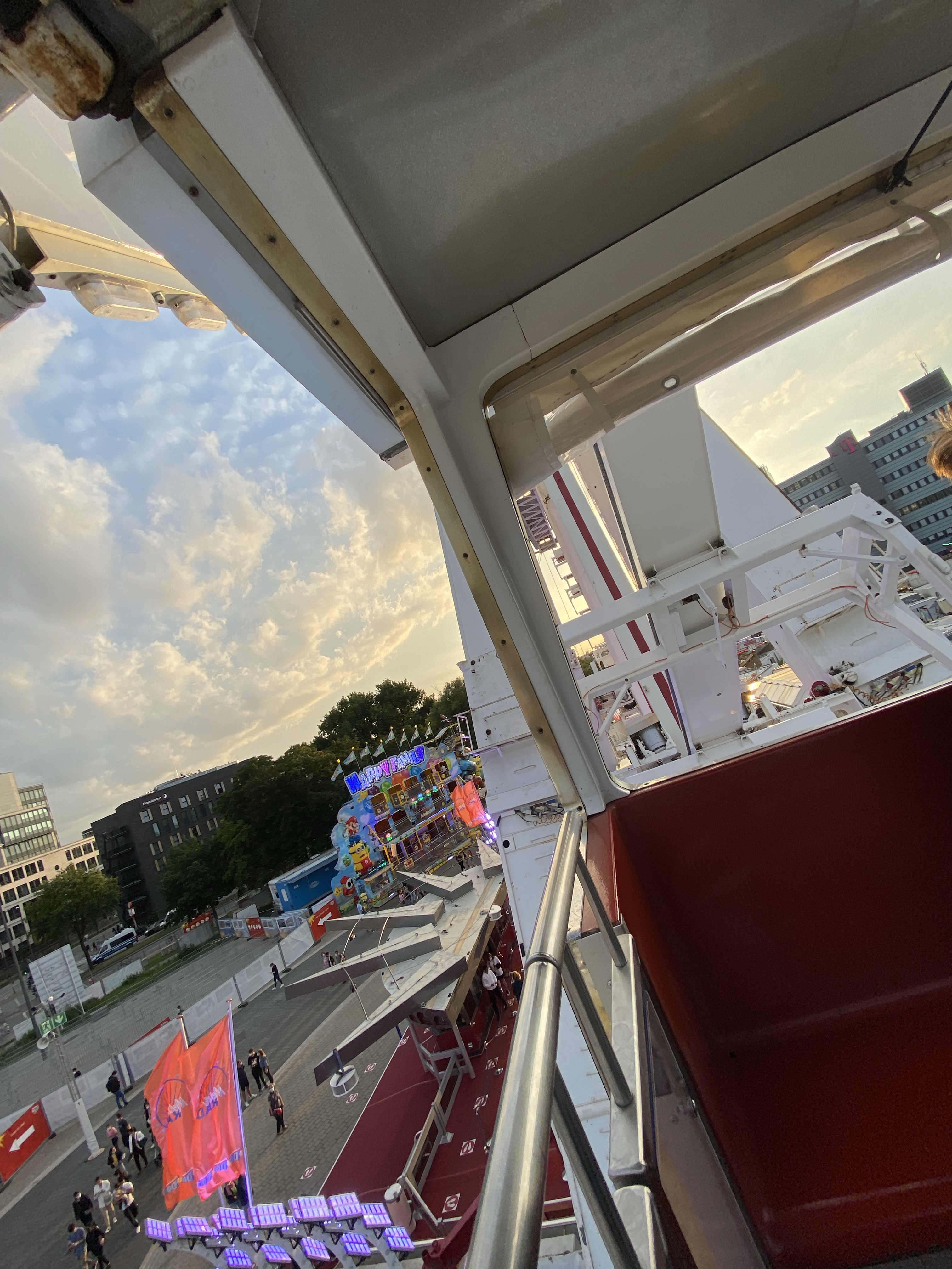 Wir schlendern über das Gelände, inspizieren die Fahrgeschäfte (nein, da niemals rein, das da vielleicht, wer kommt mit in die Wildwasserbahn und wer geht in die rasende Schlange?), wir sitzen vorm Bierstübchen und essen und trinken, wir lachen und plaudern und hat das Riesenrad nicht ein neues Design?, wir essen und trinken noch mehr, fahren Karussell und quietschen, winken, fliegen mit dem Kettenkarussell durch den Abend und baumeln mit den Beinen, und dann, wie immer, krönen wir den Abschluss unseres Dombesuches mit der Fahrt im Riesenrad, hoch oben in der Gondel staunend über die Schönheit der Stadt, die winzigen Fussballer da unten im Millerntorstadion (Lokalderby HSV:Sankt Pauli), dahinten die Kräne des Hafens vorm rosanen Abendhimmel, dort blau-blinkend die Polizeiwagen, die sich für das Spielende bereitmachen, wir lachen und schweigen und geniessen den Abend, wie früher, fast so wie immer.