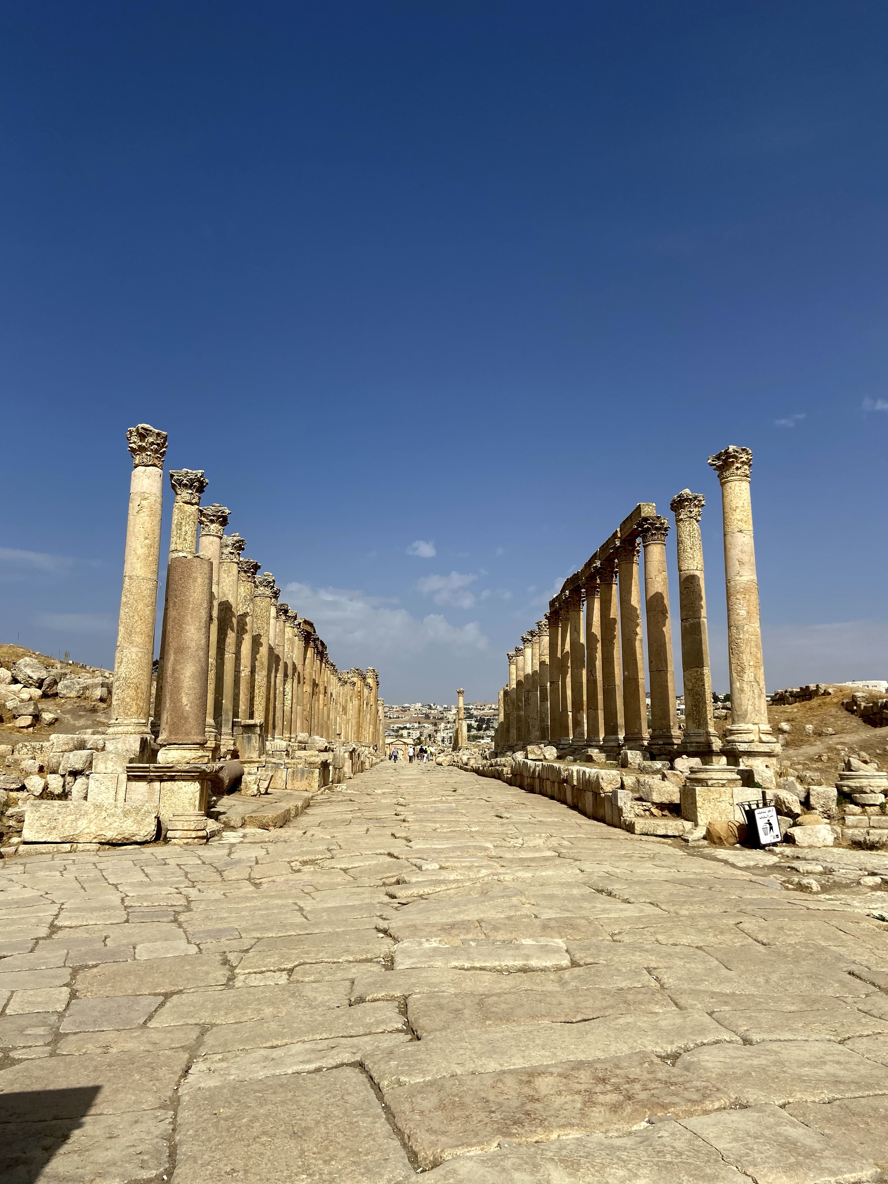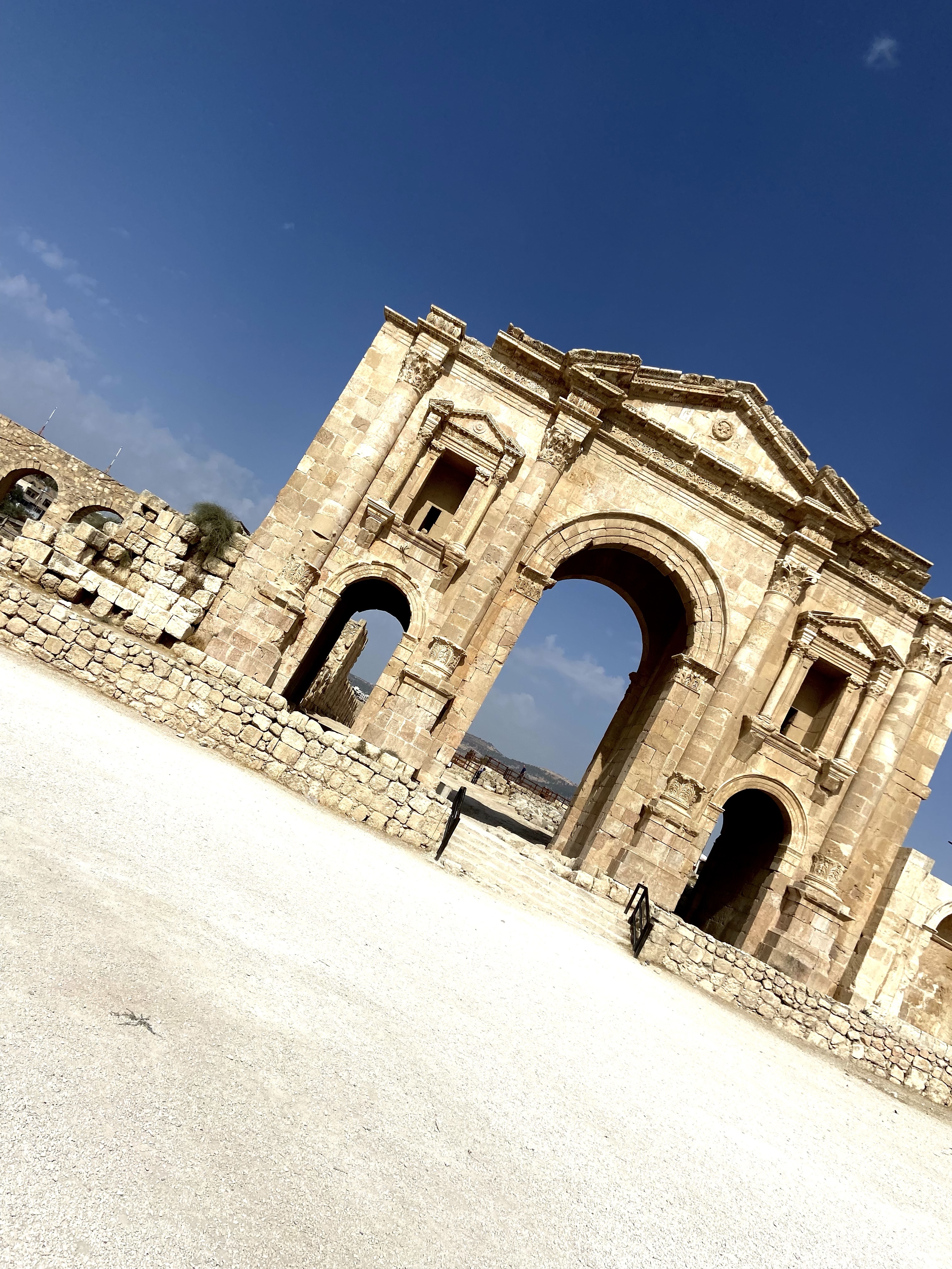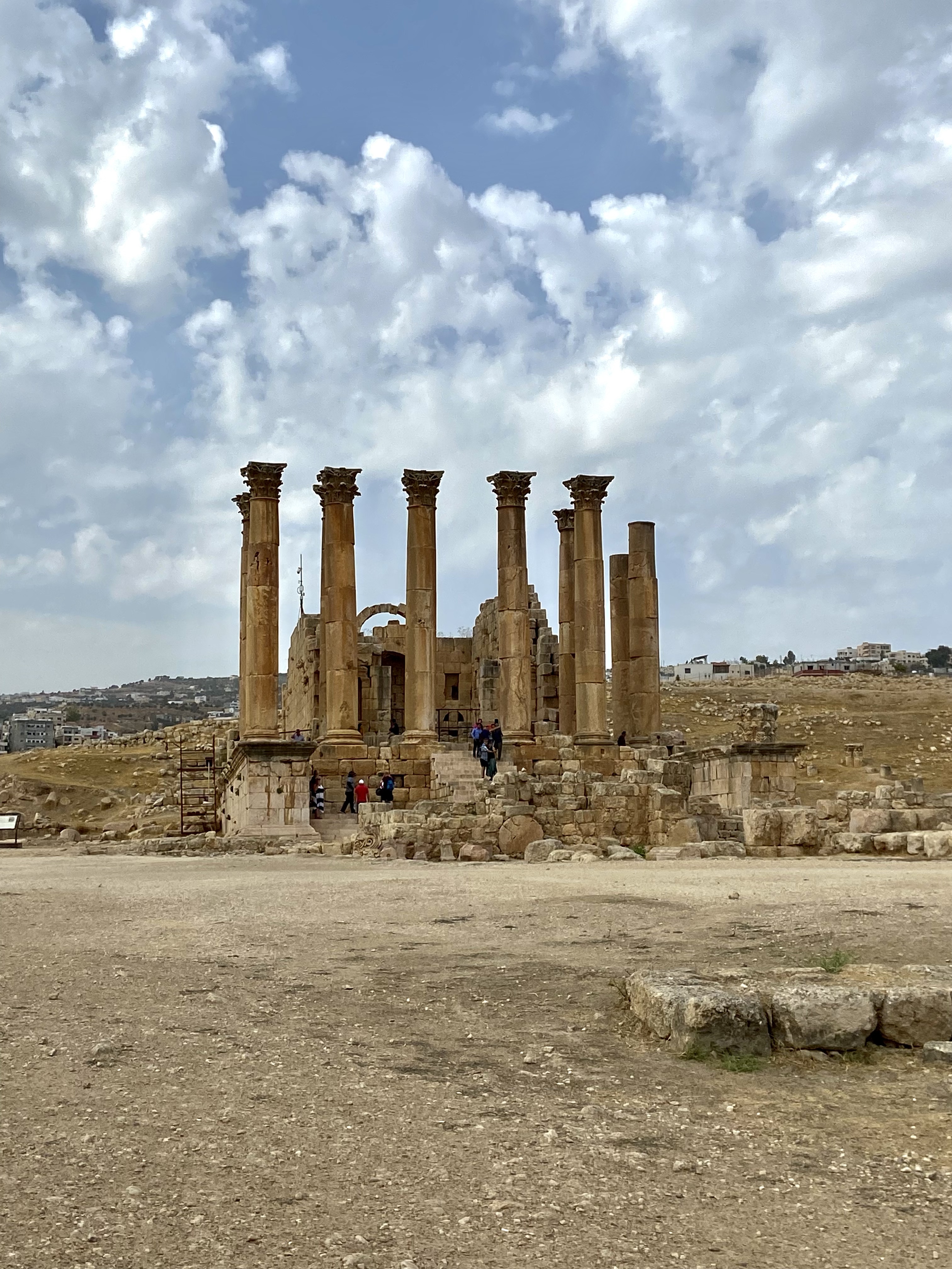 Gerasa (Jerash) begrüsst uns mit sengender Hitze. Wieder einmal mehr merke ich, dass ich hitzeempfindlich geworden bin und suche die rar gesäten Schattenplätzchen in den Felsen. Wir gehen über einen Basar mit passablen Toiletten und treten durch den Hadriansbogen ins alte Jerash ein. Was wären wir ohne die Römer. Kaiser Hadrian kenne ich noch aus England, wo wir über die Hadrianswall stolperten. Hippodrom, Forum, Jupiter-Tempel, Nymphäum, Artemis-Tempel, wir schreiten auf säulenumrahmten Wegen, an denen sich früher die Geschäfte aneinanderreihten, und wieder einmal bewundere ich die Römer für ihre intelligenten und imposanten Bauten, Abwassersystem inklusive.