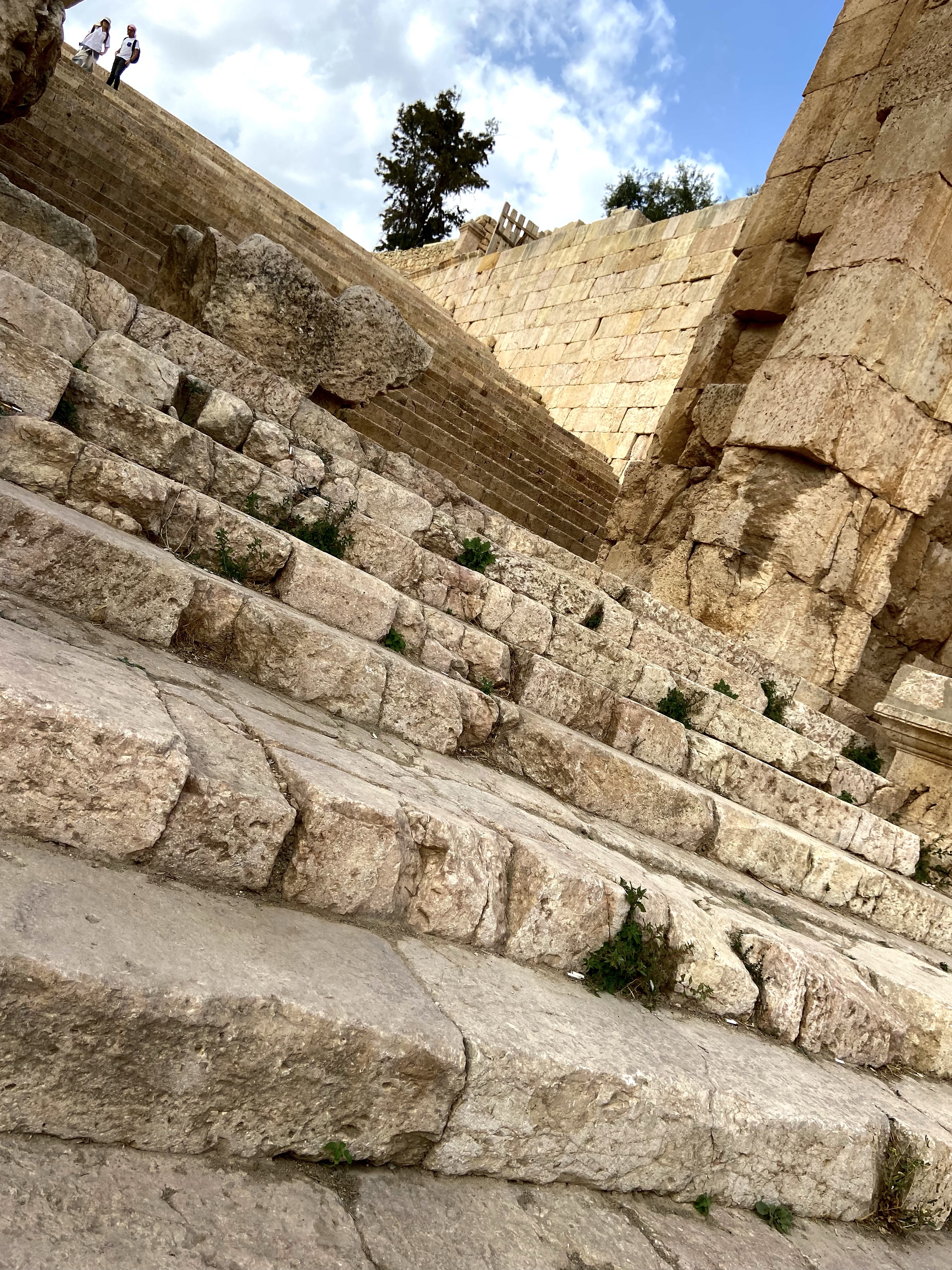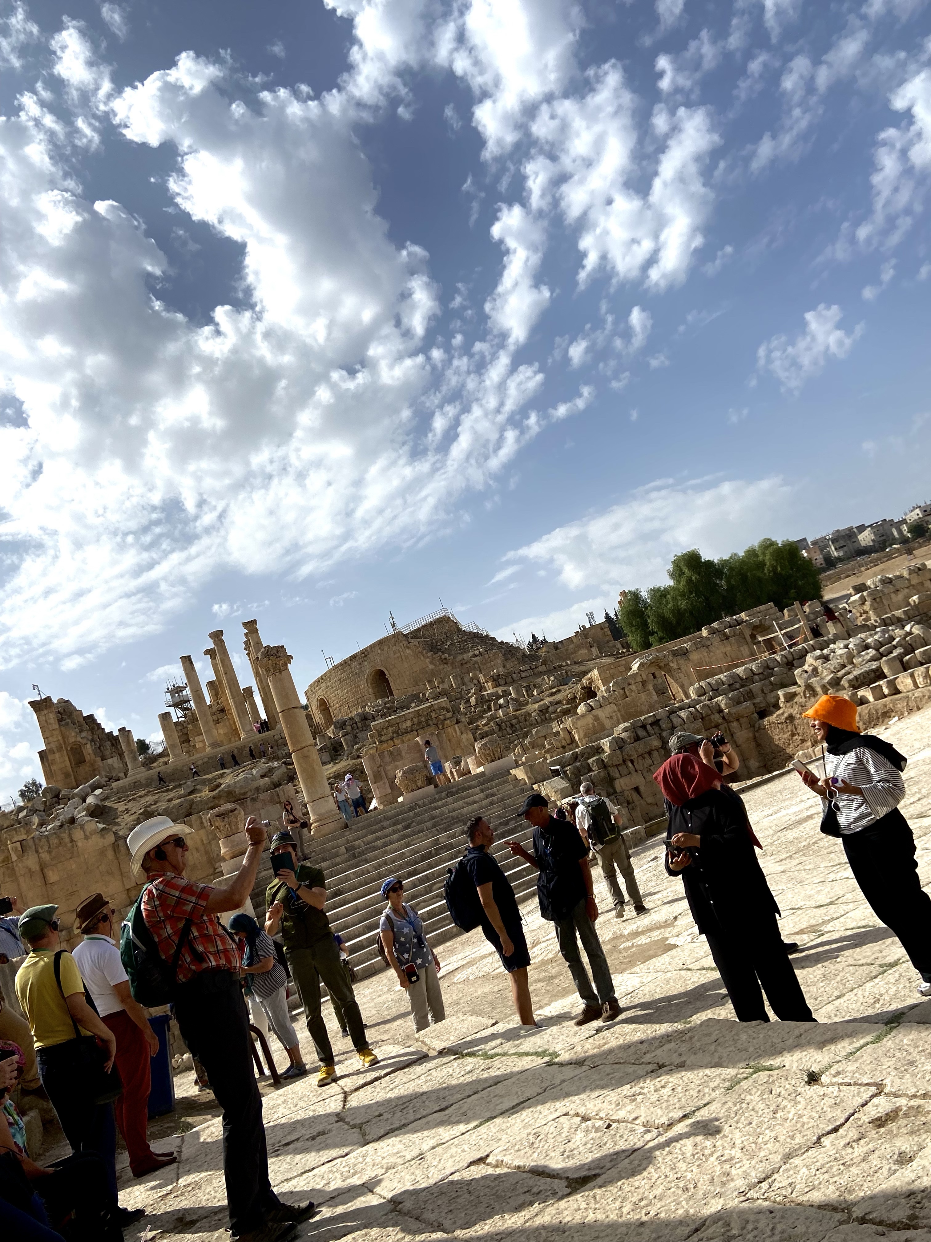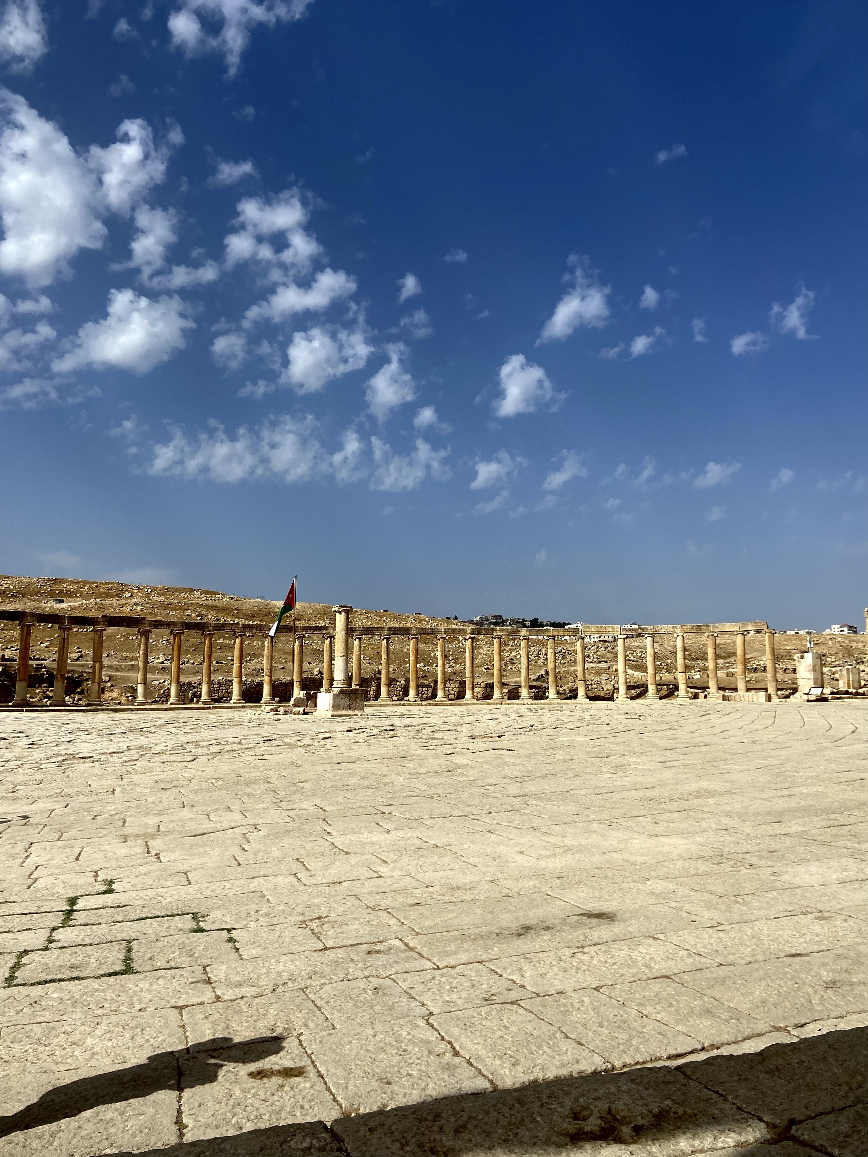 Gerasa (Jerash) begrüsst uns mit sengender Hitze. Wieder einmal mehr merke ich, dass ich hitzeempfindlich geworden bin und suche die rar gesäten Schattenplätzchen in den Felsen. Wir gehen über einen Basar mit passablen Toiletten und treten durch den Hadriansbogen ins alte Jerash ein. Was wären wir ohne die Römer. Kaiser Hadrian kenne ich noch aus England, wo wir über die Hadrianswall stolperten. Hippodrom, Forum, Jupiter-Tempel, Nymphäum, Artemis-Tempel, wir schreiten auf säulenumrahmten Wegen, an denen sich früher die Geschäfte aneinanderreihten, und wieder einmal bewundere ich die Römer für ihre intelligenten und imposanten Bauten, Abwassersystem inklusive.