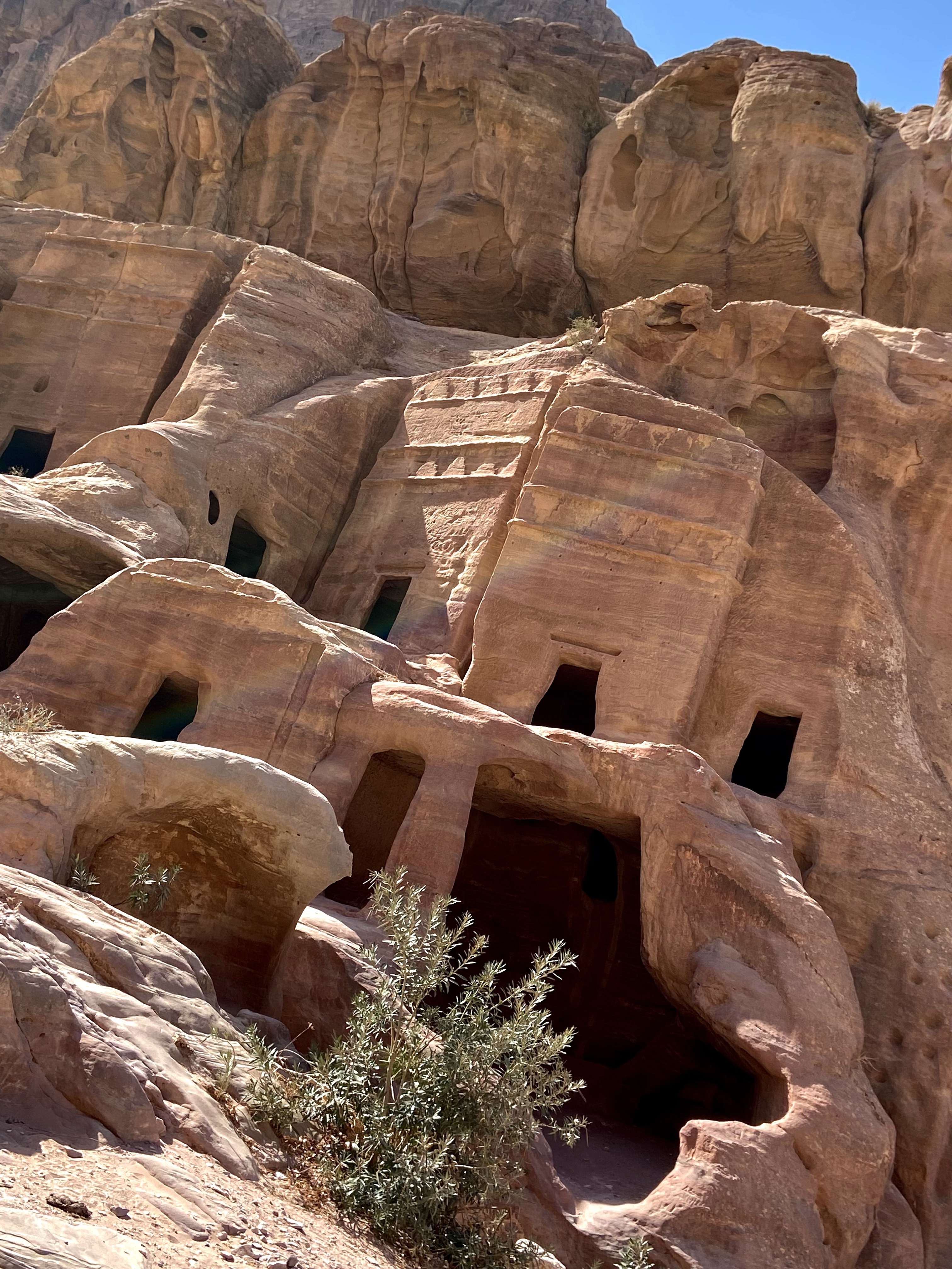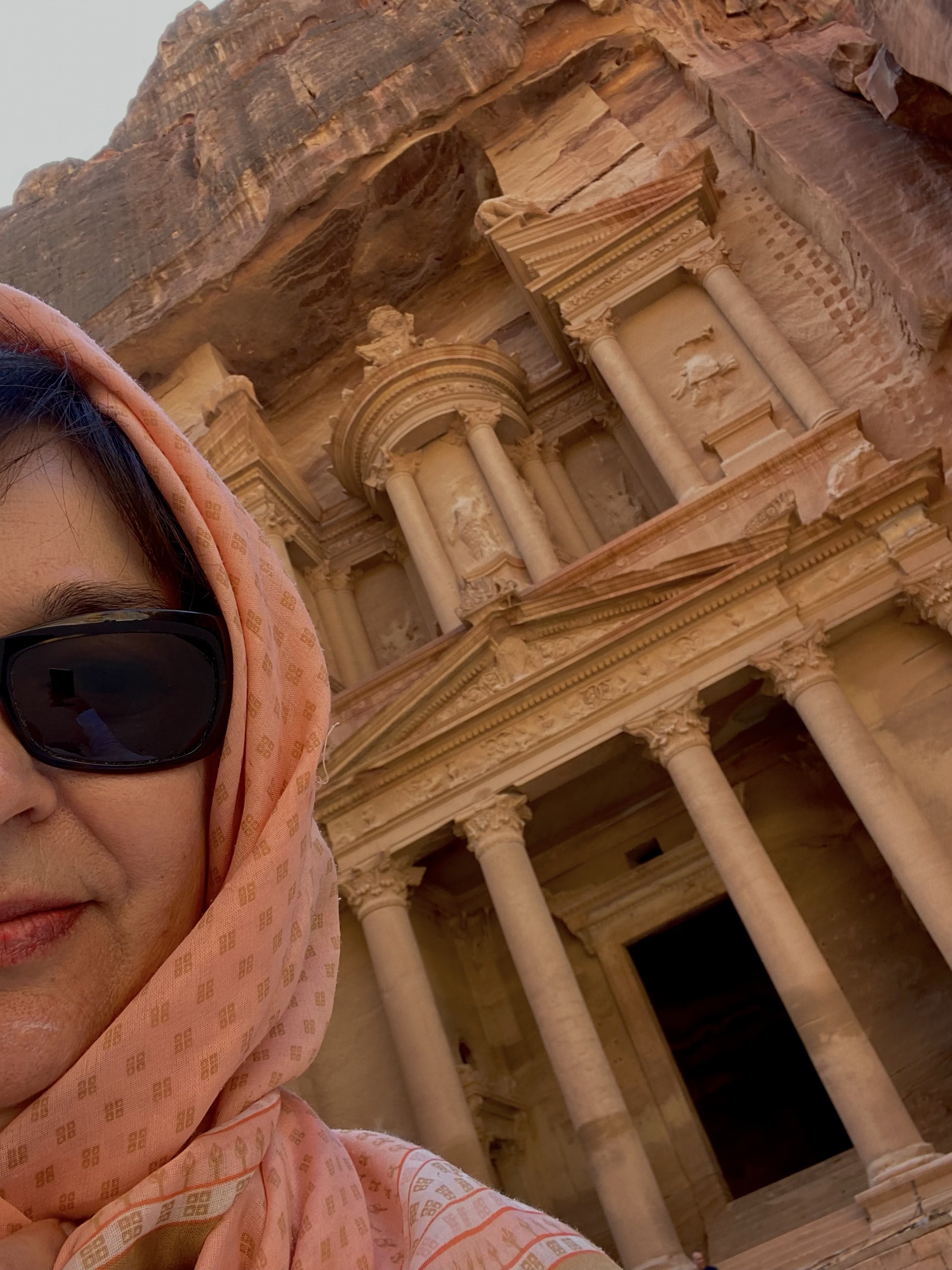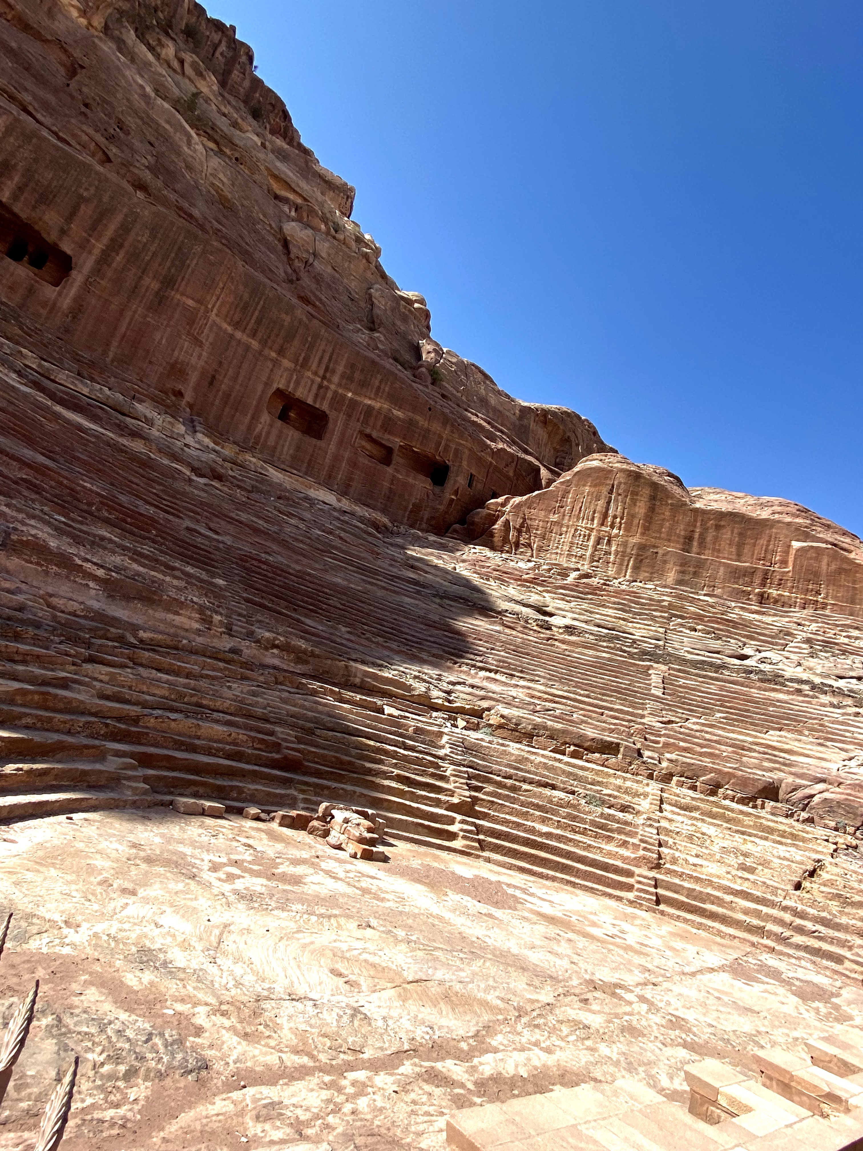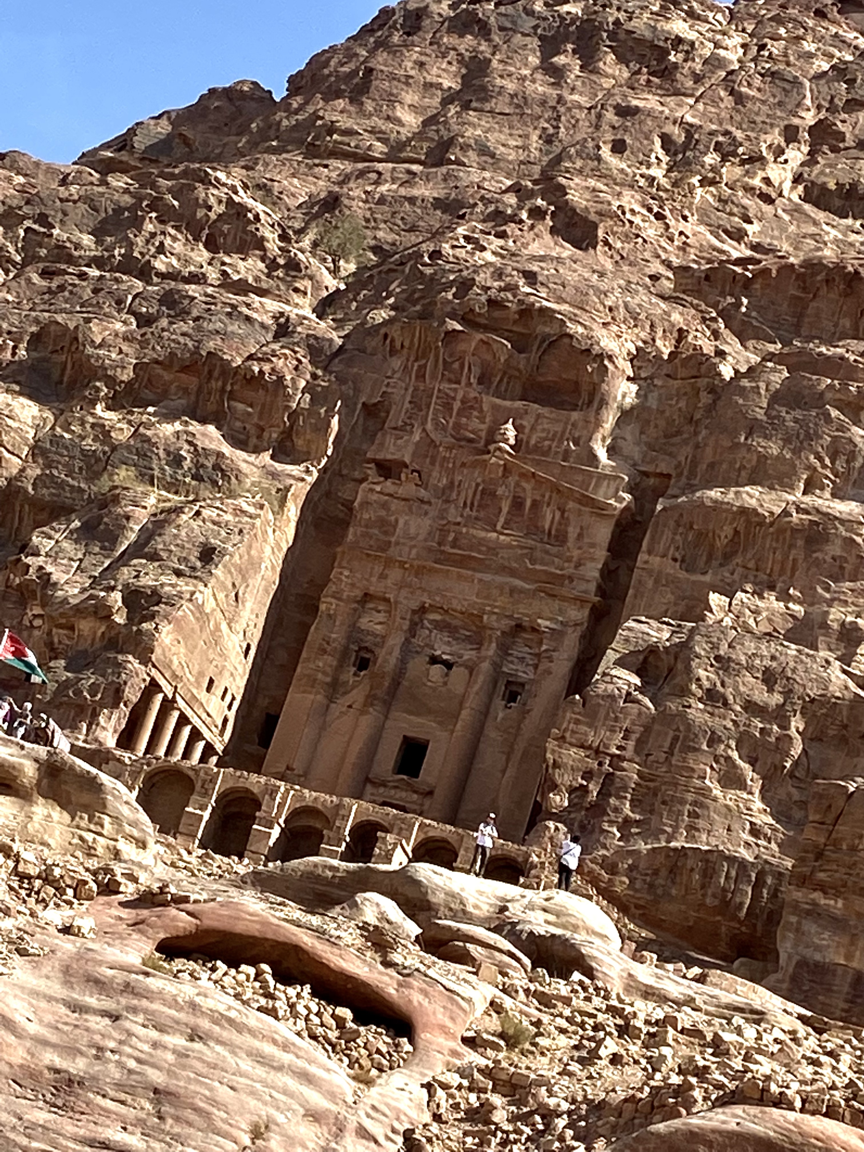 Das tut nix für meine innere Balance, und ausserdem komme ich hier selbst zurecht, bin ich schon gestern Nacht bis zur Schatzkammer vorgedrungen. Auch bei Tageslicht ist es beeindruckend: die Felsen ragen bis weit in den Himmel, winden sich den Weg entlang, weiten sich, verengen sich, wechseln die Farbe, sind rauh und mal glatt, lassen ab und an den Himmel wie zufällig blau aufleuchten, und geben nach zwei Kilometer und einer letzten Wende den Blick auf die Schatzkammer frei. Ich fühle mich hier wohl, fast heimisch, am Fusse des riesigen Schatzhauses, das ein Jahrhundert v.Chr. erbaut wurde. Ich spaziere weiter, überall in den Felsen tauchen weitere Grabstätten auf, ein römisches Theater, Tempel und Säulen.