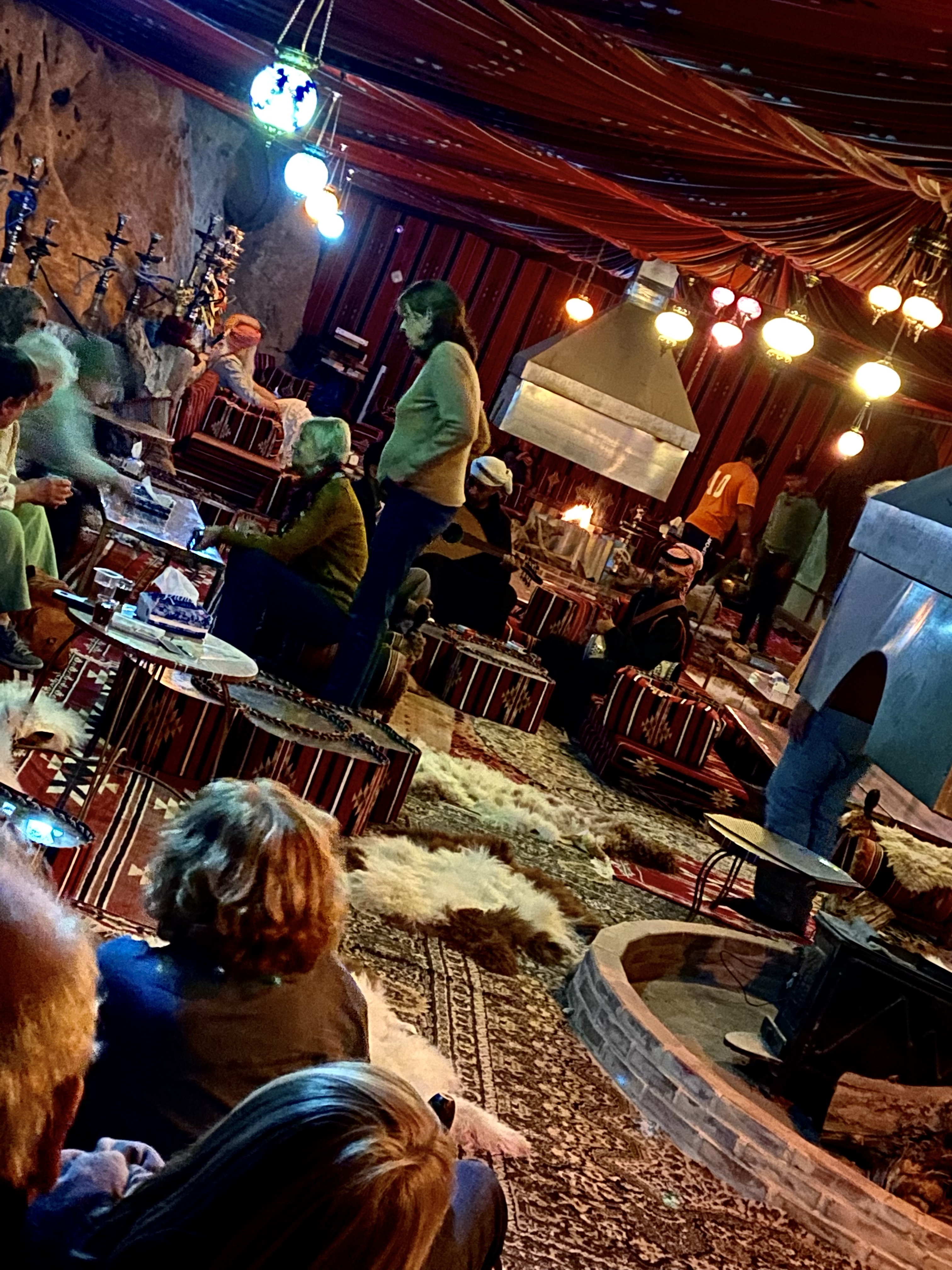 Das lerne ich beim lang ersehnten Dinner bei den Beduinen, von dem wir alle recht enttäuscht sind, da wir uns vor kleinen Zelten bei Fackelschein im Sand der Wüste sitzend wähnten. Wir sitzen allerdings in einem Restaurant, das nur entfernt an ein Zelt erinnert oder wie die ganz enttäuschten Mitreisenden sagen: das hier sei bestenfalls eine Beduinen-Kantine. Es ist laut, gross und voll, aber das Essen finde ich lecker (auch wenn ich nur reduziert esse, weil Magen…). Gisela kommt triumphierend mit einem echten Bier zurück, immerhin etwas.
