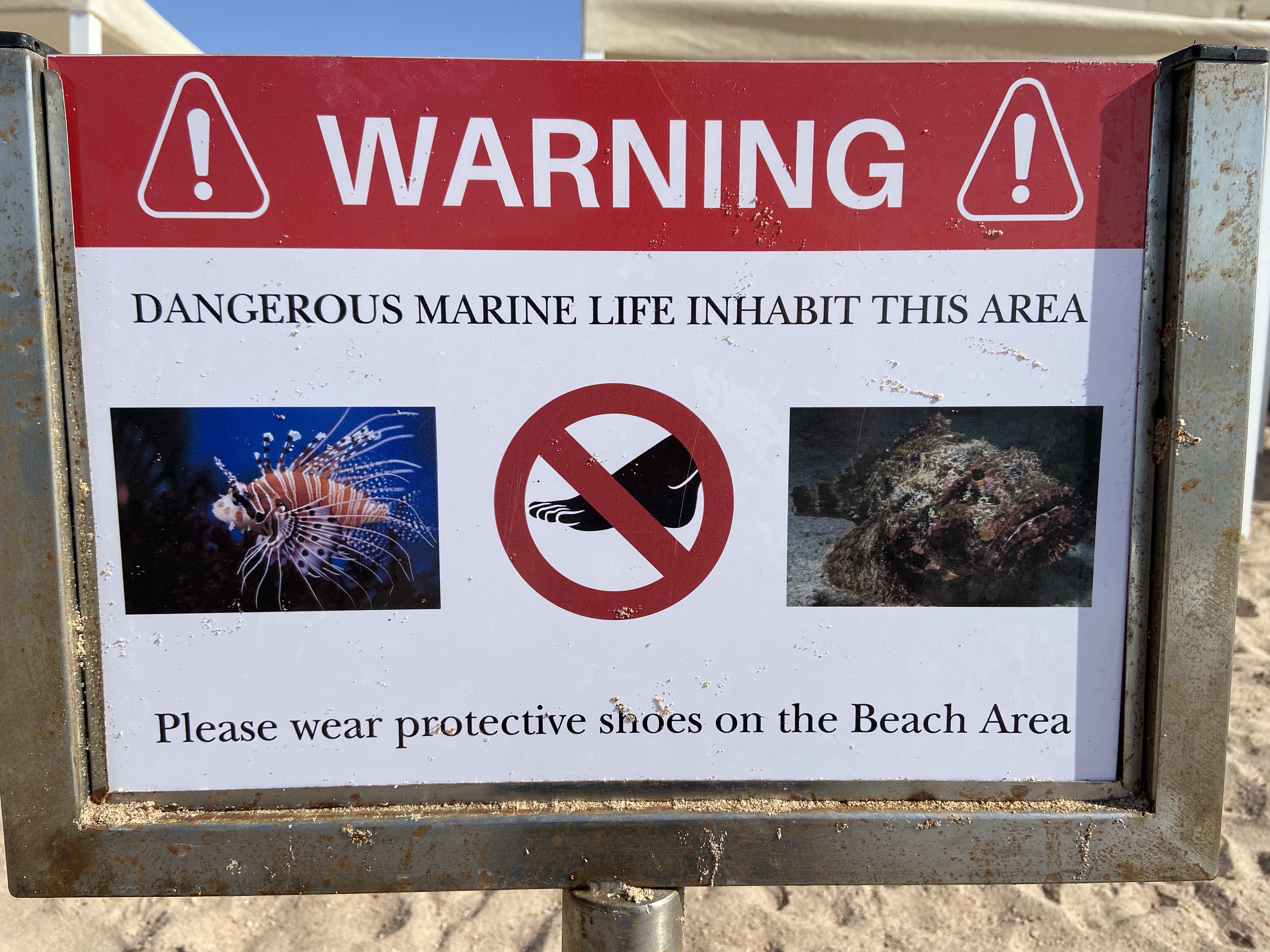 Am Nachmittag gehe ich in einen der vielen Pools schwimmen, leer ist es und sonnig. Ich suche mir noch einen Schattenplatz am Strand und tauche mit den Füssen ins Rote Meer. Matthias war bereits drin, barfuss, wovon auf den vielen Schildern ob der gefährlichen Fische abgeraten wird und ist auf etwas stacheliges getreten. Ausserdem ist sein Rücken rot, da er die Bekanntschaft einer Feuerqualle gemacht hat. Ich weiss, warum ich den harmlosen Pool vorziehe. Better safe than sorry.