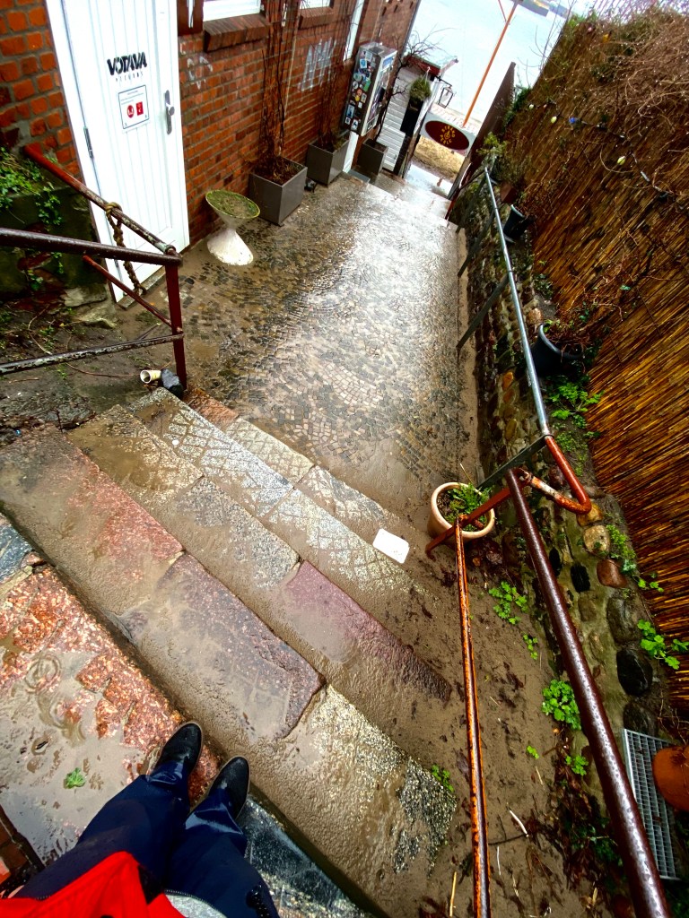 Und dann wandere ich durch den Regen. Etwas ratlos bin ich schon, denn der Regen will nicht enden, und der Wind, der endet auch nicht. Das Wasser rinnt von der Kapuze über die Mütze ins Gesicht herunter, während ich meine nassen Hände in die Jackentaschen stecke.