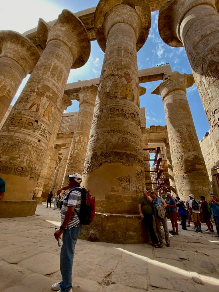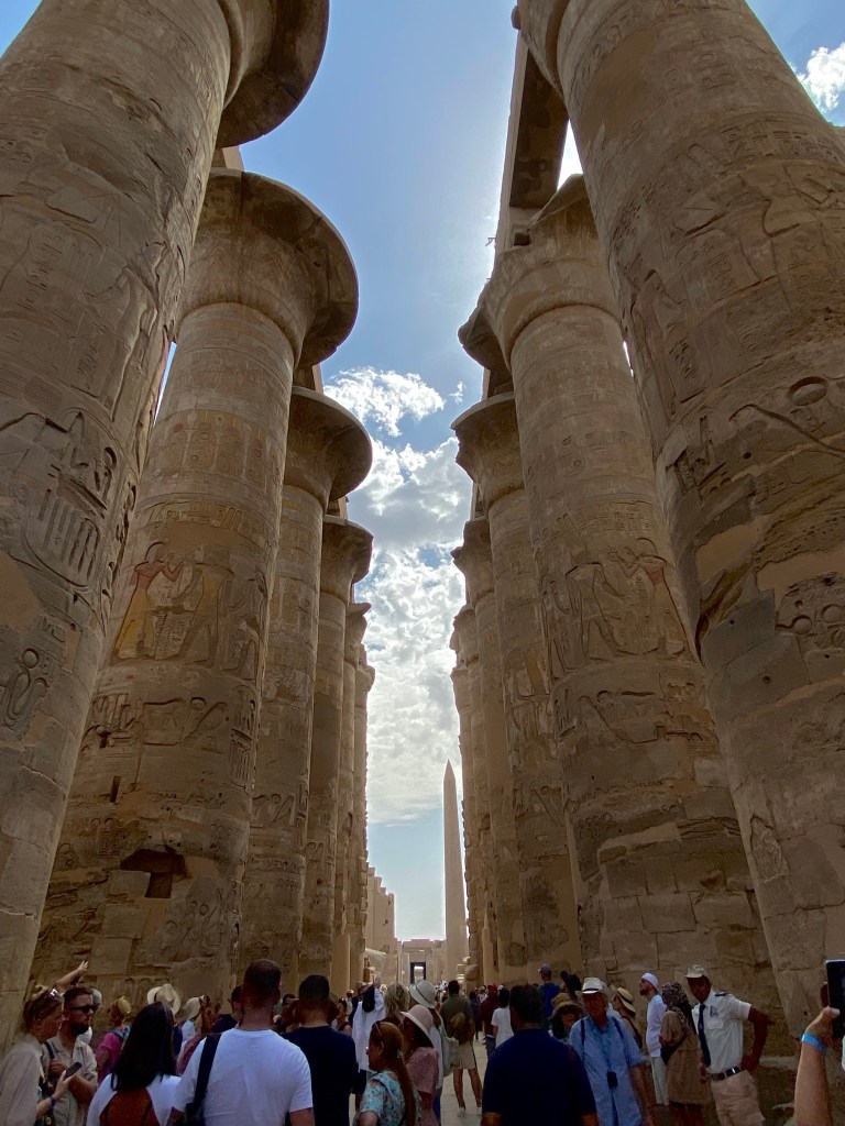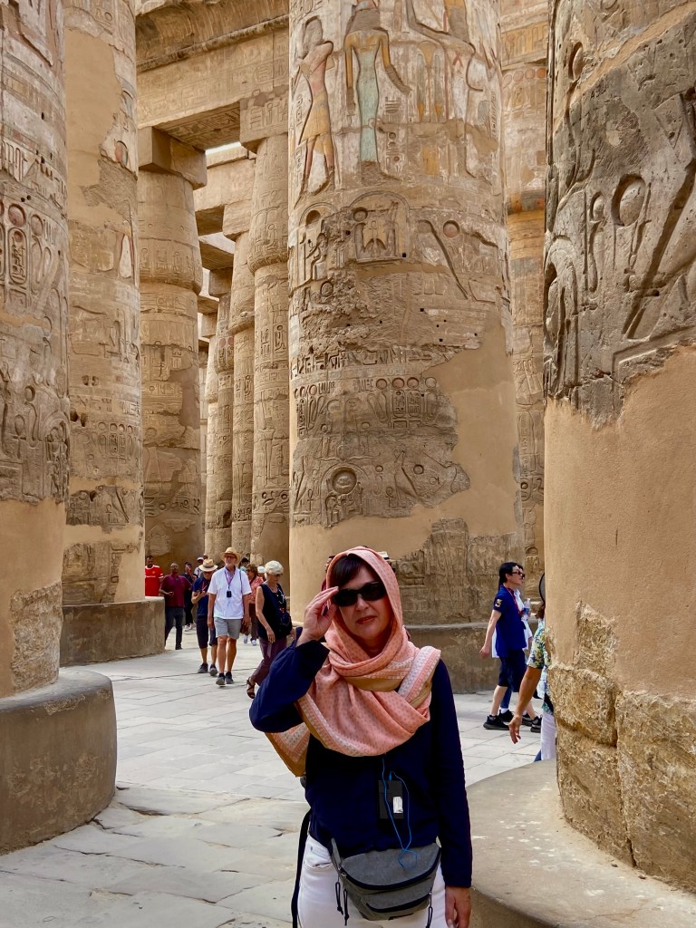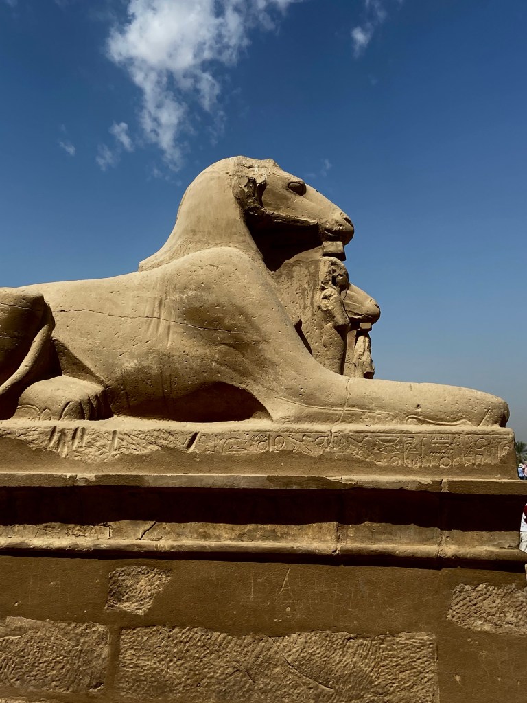 Hildegard hat Fächer erstanden und schenkt mir, die ich mit knallrotem Kopf in den Seilen hänge, einen ihrer Exemplare. Über 40 Grad sind es in Luxor, wo wir in Karnak, der grössten Tempelanlage Ägyptens, die berühmten Widder-Sphinxe besuchen. Im gigantischen Säulenwald versuche ich, jedes Schattenplätzchen mitzunehmen, aber unser ägyptischer Guide kennt keine Gnade und setzt seine Erläuterungen lang und gern unter praller Sonne an.
