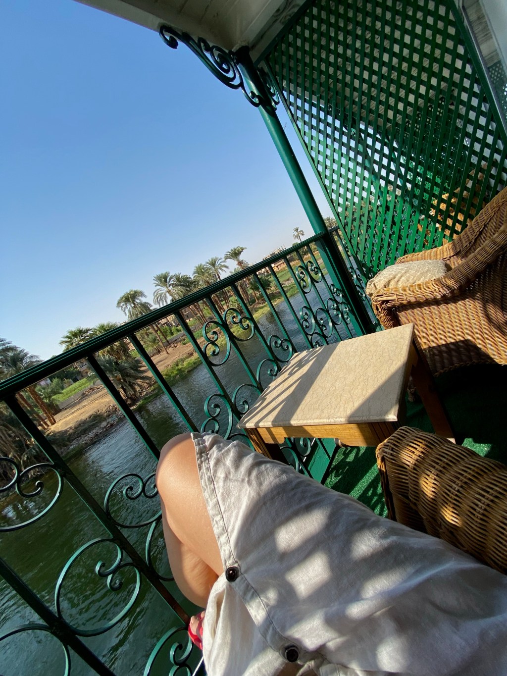 Um 15.00h höre ich es tropfen; das Wasser kommt aus der Kabinendecke, über mir liegt das Pooldeck. Entwarnung vom Technikteam: vier Ägypter stehen in meiner Kabine und reparieren die Klimaanlage. Derweil sitze ich auf meinem Balkon mit dem verschnörkelten Geländer und winke den badenden Kindern zurück, während wir am palmenumsäumten Ufer des Nils entlanggleiten. Teatime auf dem Pooldeck, schöne Gespräche mit den wieder anwesenden Mitreisenden, Sonnenuntergang. Endlich kommt Tod-auf-dem-Nil-Feeling auf!