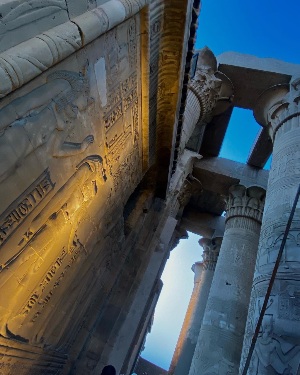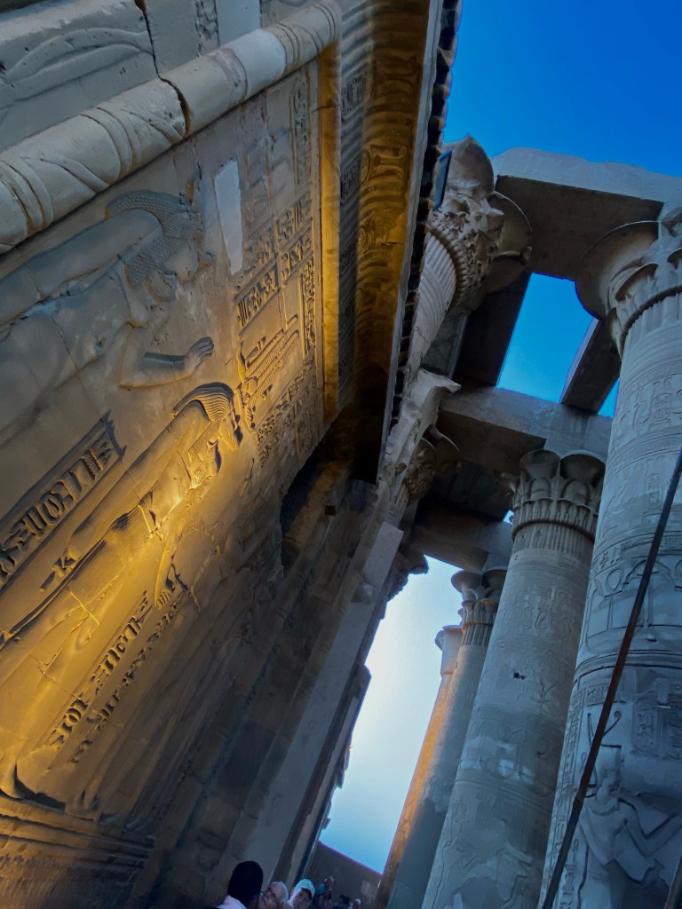 Nachmittags legen wir am Kom Ombo Tempel an, der den Göttern Sobek und Haroeris gewidmet ist. Ich mache eine neue Reisegruppe für die Rückreise auf, ich fliege mit zwei österreichischen Lehrern bis nach Wien. „Da wir sechs Stunden Zeit beim Umsteigen haben, können wir uns betrinken“, so meine whiskeyerprobten Reisebegleiter. Nun ja….Abends Motto-Party der Amerikaner in der Bar, Rüdiger kommt in Kaftan, Kopfbedeckung und angemalten schwarzen Schnurrbart aus der Kabine. Wir sitzen oben an Deck und geniessen die frische Luft und die schwarze Nacht.