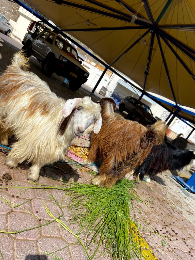 Wir waren heute in einer Hotelfachschule (interessant), auf einem Ziegenmarkt (die für die gerade stattfindenen Festessen angeboten werden), auf dem Fischmarkt (A. und ich haben ob des intensiven Geruchs draussen auf ner Bank gewartet), auf dem Obst- und Gemüsemarkt (super), auf dem Gelände vorm Sultanspalast (dem „Büro“), am Meer und im Pool.