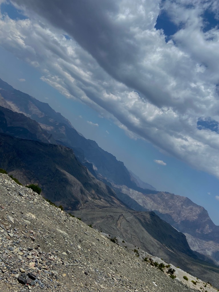 Wenn auch nur ein Regentropfen fällt, kehren wir um, entscheidet Yassir, der Chef unserer vierköpfigen omanischen Jeepmannschaft. Dort, wo eben noch das Gebirge zu sehen war, ist jetzt eine dunkle graue Wand. Der erste Tropfen fällt auf die Windschutzscheibe. Offroad über den Pass weiter durch die Wadis zu fahren, wäre zu gefährlich, da die Mischung aus feinem Sand und Regen zu einer glitschigen Masse gerät, die selbst unsere Jeeps nicht bewältigen können.