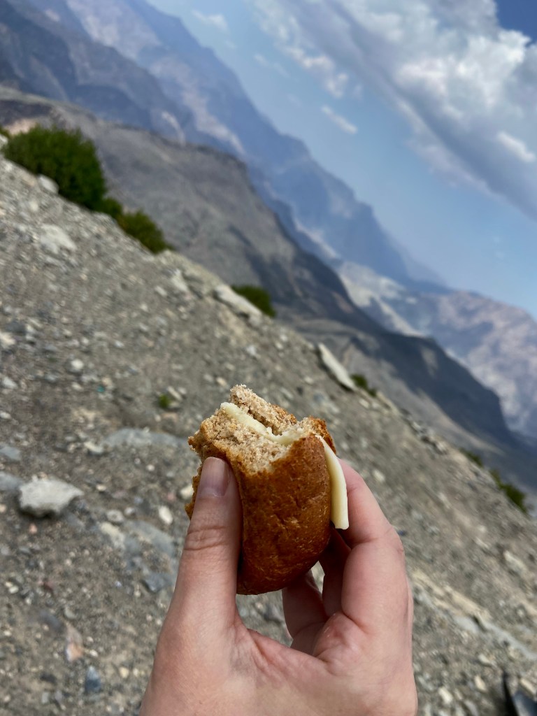 Wir machen eine kurze Lunchpause (ich kann Cracker und Kekse nicht mehr sehen) oben auf 2000 Meter, dann geht es die sicherere Route unter Regengeprassel wieder bergabwärts.