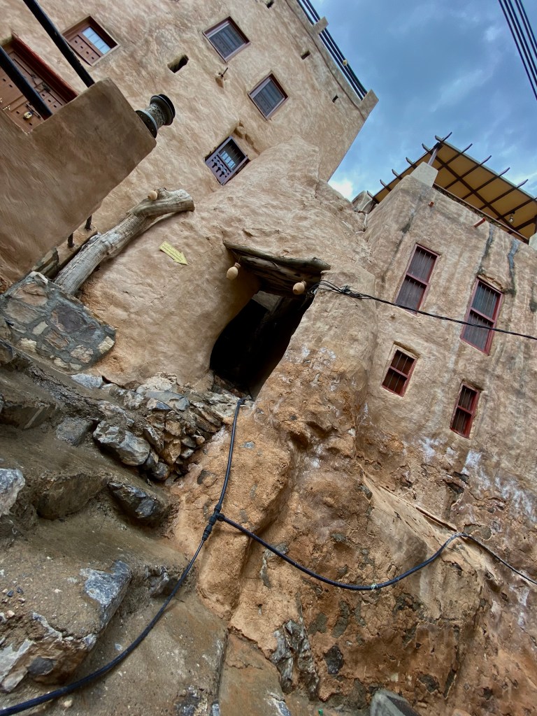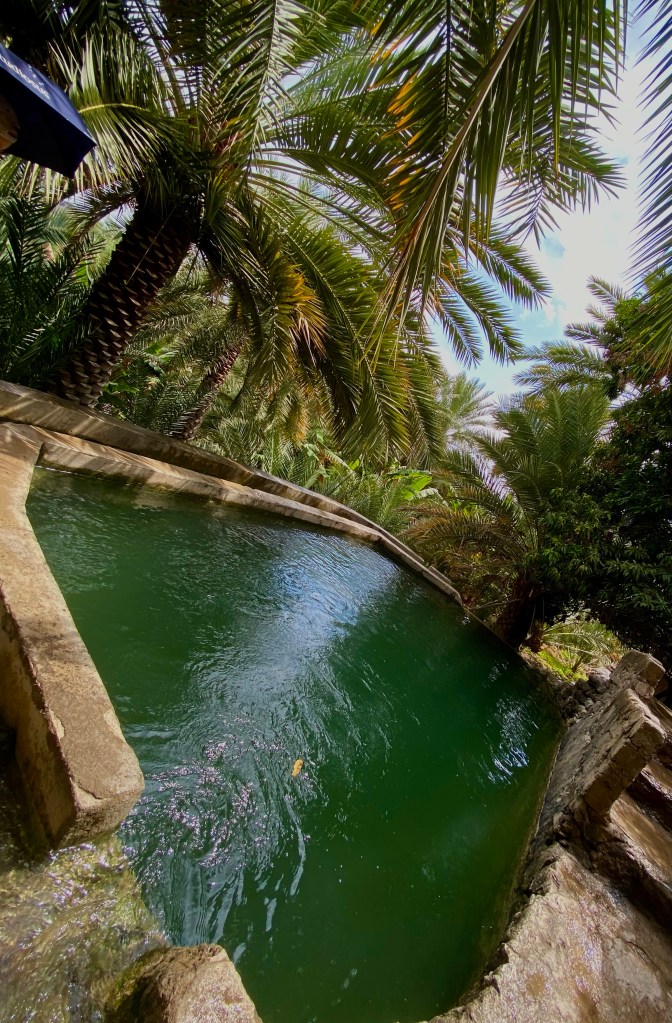 Statt ins Wadi geht es in den alten Teil des Dorfes Al Misfah Al Abriyeen. Wir laufen treppab- und treppauf. Um uns verlassene Gemäuer, dichte, dunkelgrüne Gärten aus Palmen und exotischen Büschen, wir balancieren entlang eines kleines Baches, der einer madeirensischen Levada gleicht. Inmitten des ganzen ein uraltes Becken mit dunkelgrünem Wasser, in dem kleine Kinder planschen. Ein Paradies.