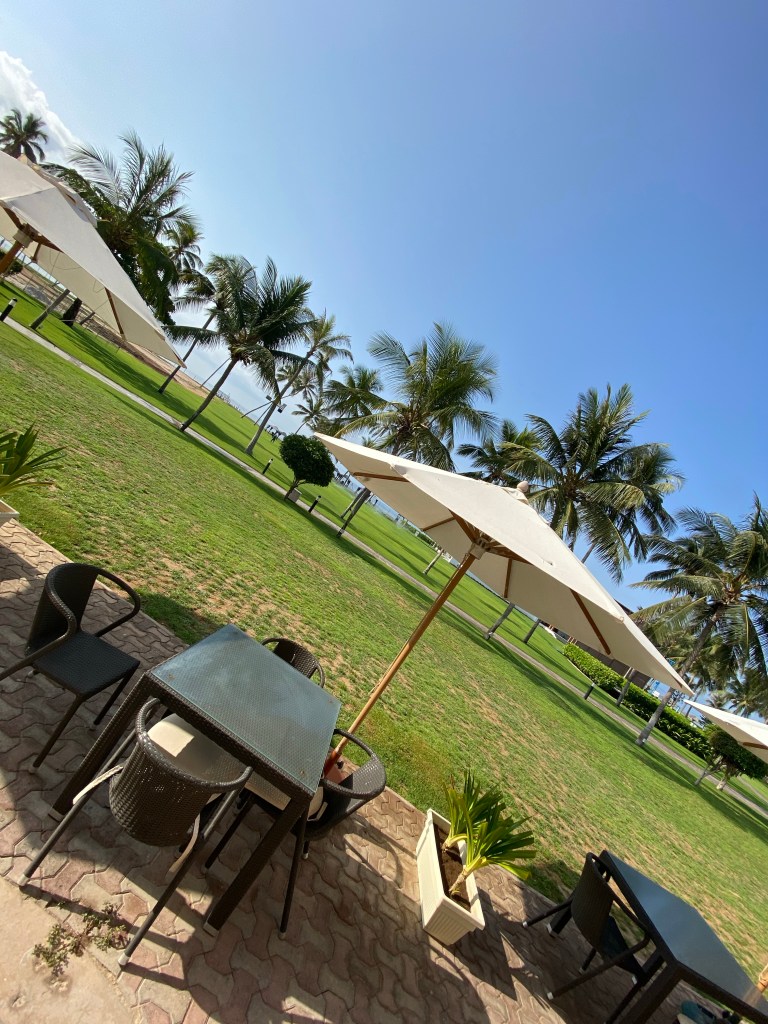 Abends Flug nach Salala, wo wir nachts in unserem Resort ankommen, völlig erledigt. Belohnt wird die Strapaze am nächsten Morgen. Von meiner Terrasse sehe ich Kokospalmen und ganz hinten den Strand und das Meer.