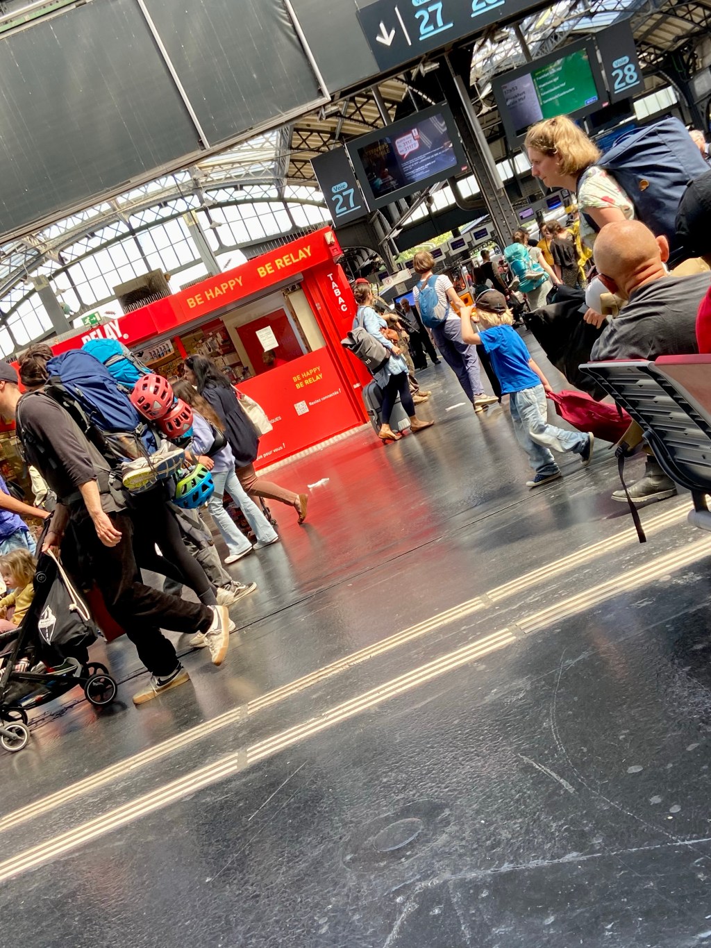 Start um 5.20h im Dunkeln an der Bushaltestelle in Pasing (der Bus kommt nicht, wir wandern vollgepackt zum Marienplatz um ein Taxi zu nehmen. 5,5 Stunden ab Hauptbahnhof nach Paris Est im TGV (dem Kind ist schlecht, es übergibt sich, spricht und isst nix, und ich bin ratlos), weiter mit der Metro 4 nach Les Halles (dem Kind geht‘s besser), dann mit dem RER A bis nach Nation, Schienenersatzverkehr mit Linie 1 bis St Vincennes, dann den Bus bis Val Fontenay, dort in den RER A bis Marne La Vallée, und dann sollte es mit dem Shuttlebus ab Bussteig Q ins Hotel gehen.