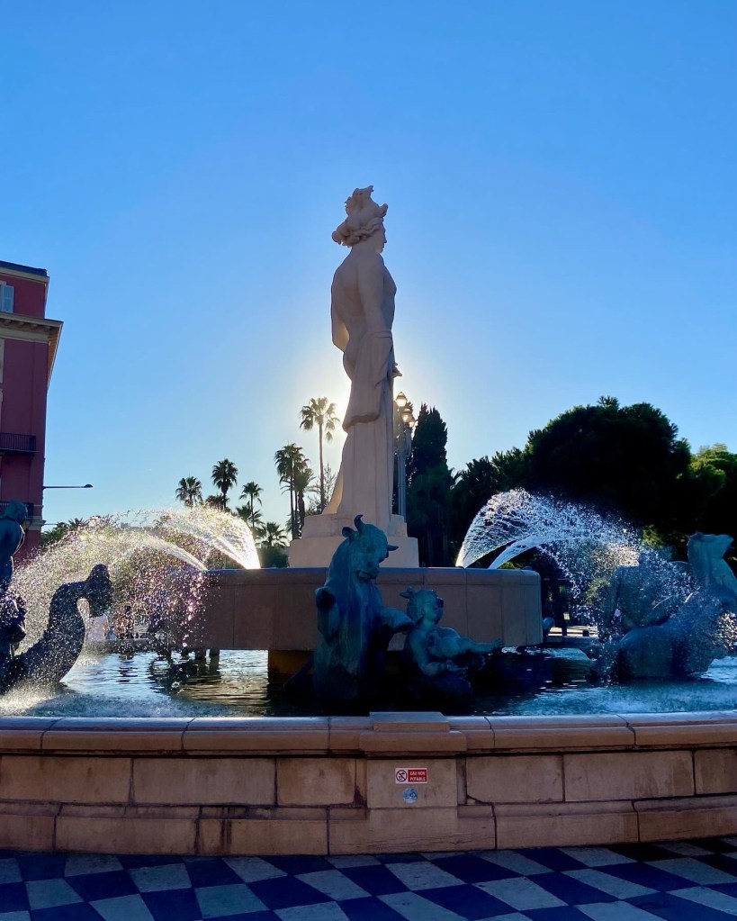 Am frühen Abend bummle ich durch die Gassen zum Place Massena, der von rot-gelben Bauten umgeben ist und an einem riesigen Springbrunnen endet.