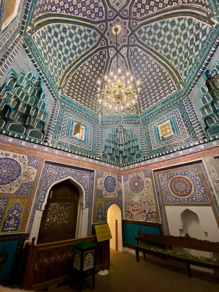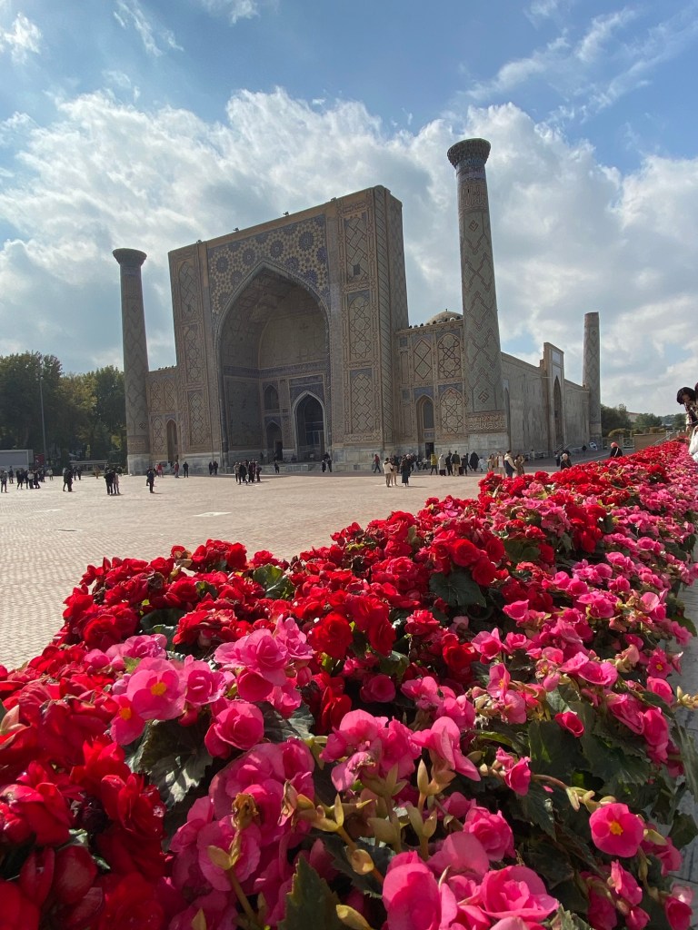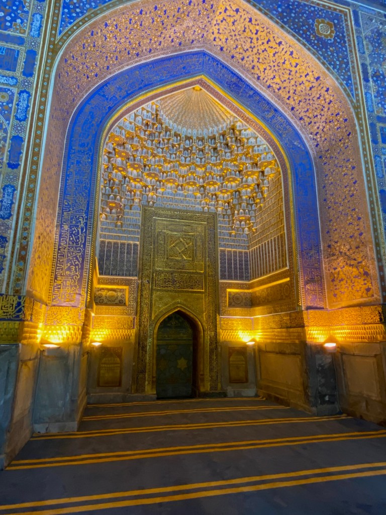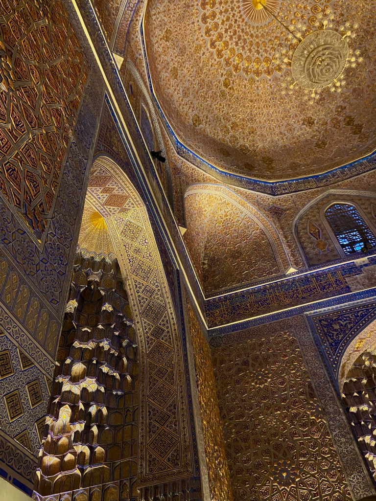 Wir sind im Märchen aus Tausendundeiner Nacht angekommen: der Registanplatz, ehemalige Koranschulen, die Bini Khanum-Moschee, das Gur-Emir Mausoleum, ein Basar, auf dem ich kiloweise geröstete Kichererbsen, frische Mandeln, Gewürze und Aprikosen mit Walnüssen erstehe, das Observatorium des Ulug Beg bei Sonnenuntergang und krächzenden Raben, die Gräberstrasse Schah-E-Sinda mit seinen Mausoleen, usbekisches Mittagessen unter alten Bäumen, die Ausgrabungsstätte Afrosiab und eine Papierherstellung schauen wir uns an, bevor wir den Nachmittag für uns haben und Schokoladenkuchen im russischen Viertel geniessen.
