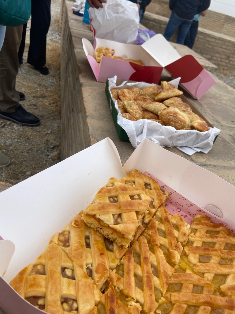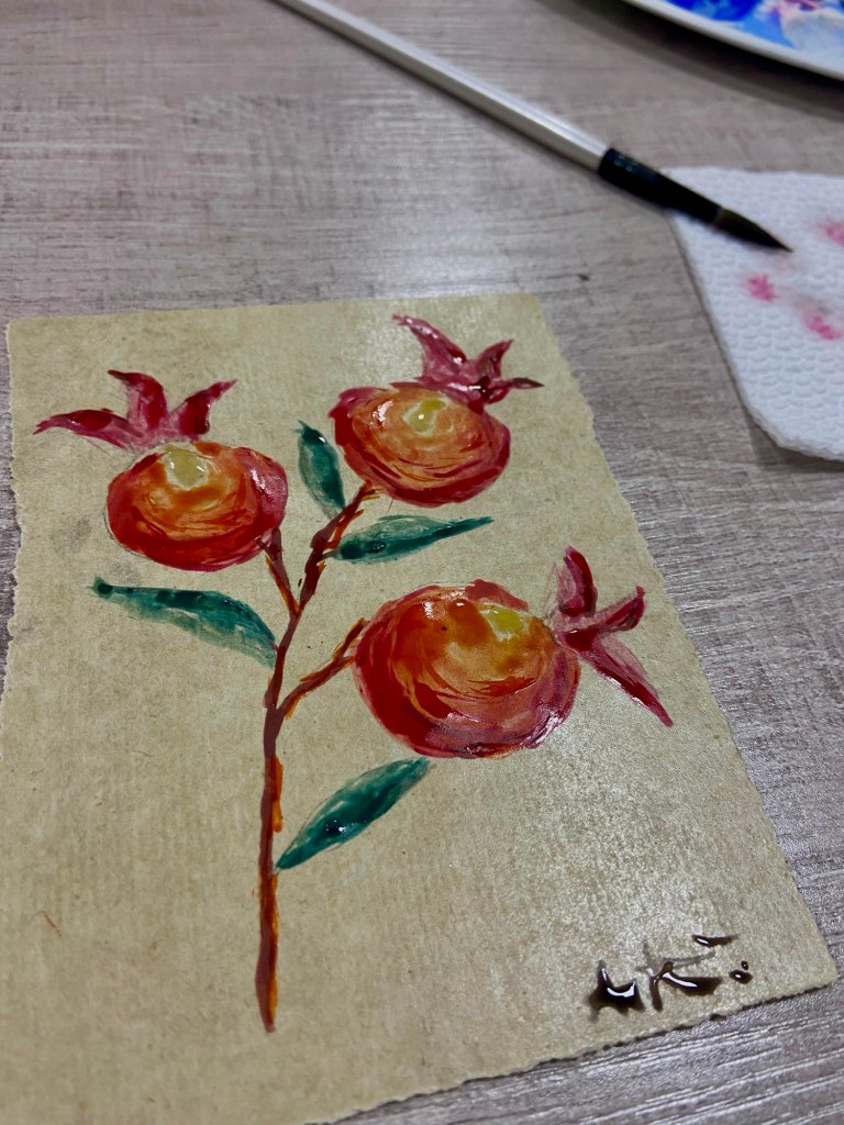 Heute stehen wir mit Irina im strömenden Regen vor dem Mausoleum eines Sufis, der Regen kann ihr nix antun, sie lacht und präsentiert fröhlich die Fakten. An der Karawanserei an der Alten Seidenstrasse wird Picknick ausgepackt, es gibt grünen Tee, Samsa mit Kürbis und Kekse, bei Usto Davron malen wir selbst Aquarelle mit Granatäpfeln, sie verbietet uns scherzhaft, auf dem Weg zum Hotel auf dem Basar stehenzubleiben und erzählt uns beim Dinner, dass sie heimlich mit der Töpfersfrau Cognac getrunken hat.