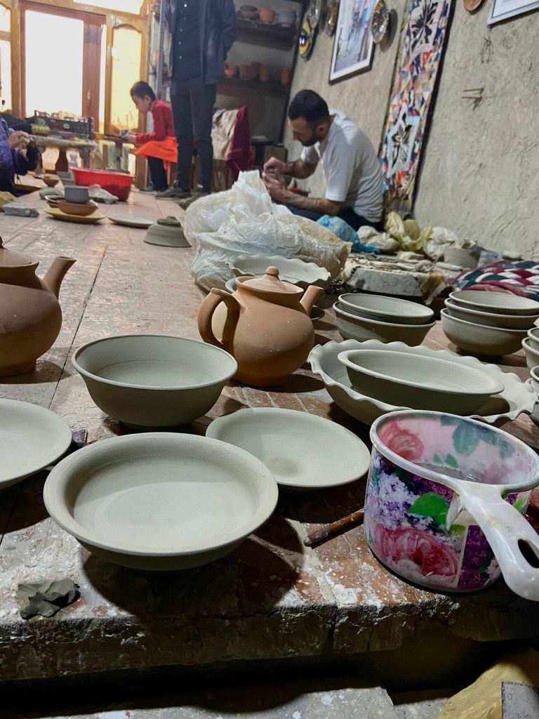 Sie bringt den Töpfer und auch den Maler, den wir in seiner Malschule besuchen, zum lachen, obwohl die Usbeker tendenziell eher ernst dreinschauen. In der Gräberstrasse von Samarkand setzt sie ein rotes Glitzerhütchen auf und erzählt uns Märchen von Scheherazade.
