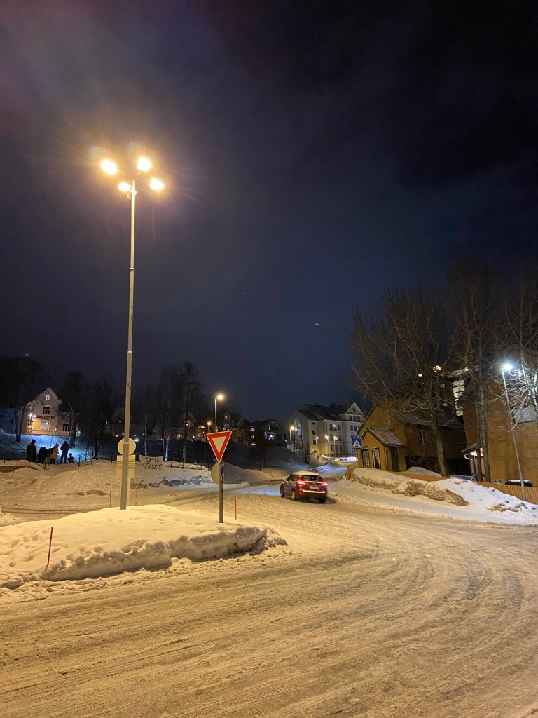 Ich fühle mich heimisch, auch wenn die ewige Nacht irritierend und die vereisten Wege gefährlich sind. Nur die Storgata ist beheizt und somit eisfreies Gebiet.