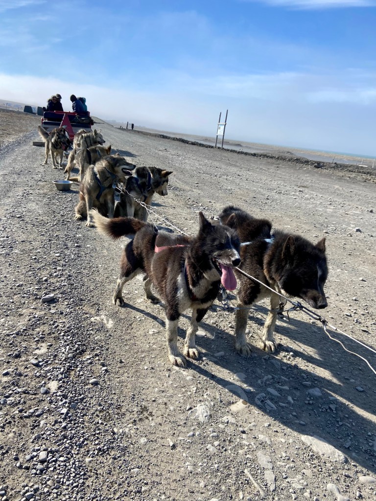 Zwölf Hunde, eine Mischung aus Huskies und Grönlandhunden, werden angespannt, ruckeln aufgeregt an ihrem Geschirr, springen durcheinander und bellen aufgeregt. Sie können es kaum erwarten, dass es losgeht. Wir auch nicht. Es geht los; sofort verstummt das Gebell, die Hunde laufen gleichmässig und konzentriert. Rechts das Meer, links der kleine Flughafen (davor der Zeltplatz mit drei Zelten, auf dem 2020 ein Mann einem Eisbären zum Opfer fiel) und um uns herum die schneebedeckten Berge. Regelmässig wird Pause gemacht, damit die Hunde trinken können. Ob man die streicheln könne? Na klar, sagt der Guide, die Hunde freuen sich!