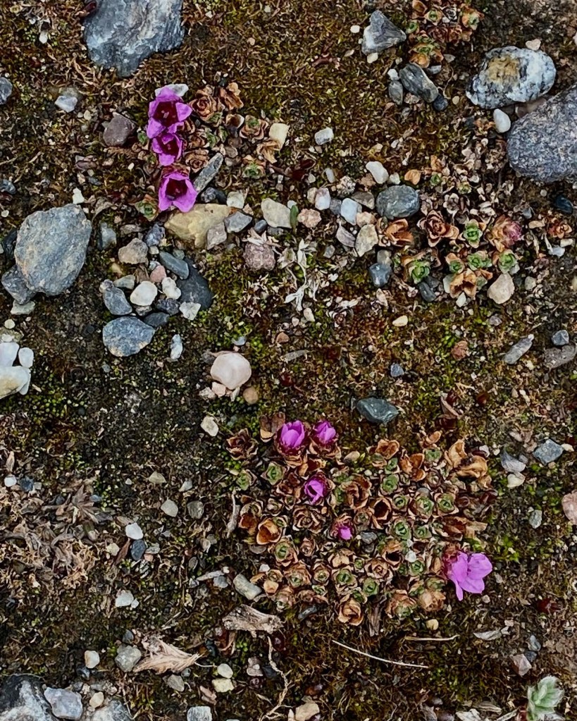 Wir lauschen einer singenden Schneeammer. Wir sehen eine brütende Kolonie von Dreizehenmöwen. Wir finden die Schlafplätze der Rentiere und lernen zu interpretieren, wie sie schlafen. Wir entdecken ein abgenagtes Skelett und Geweih eines alten Rentieres, das von einem Eisbären gefressen wurde. Wir freuen uns über kleine lila Blümchen, die sich ihren Weg durch Matsch und Eis bahnen. Wir lernen zu verstehen, wie alles hier zusammenhängt und eine Symbiose eingeht.