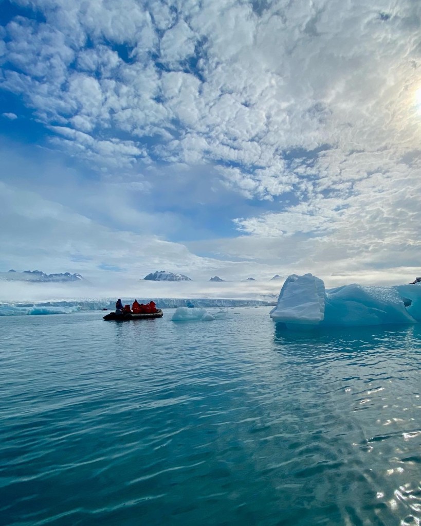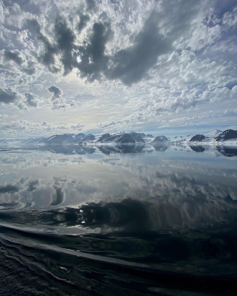 Lillihoekbreen. Kalte, klare Luft. Gewaltige Gletscher. Berge, von Wolken umschleiert. Unendlich viele Blautöne. Verschneite, unberührte Täler. Knisterndes Meer, in dem man die Eisschollen schmelzen hört. Auffliegende Vögel. Wir, ganz klein im Zodiac.