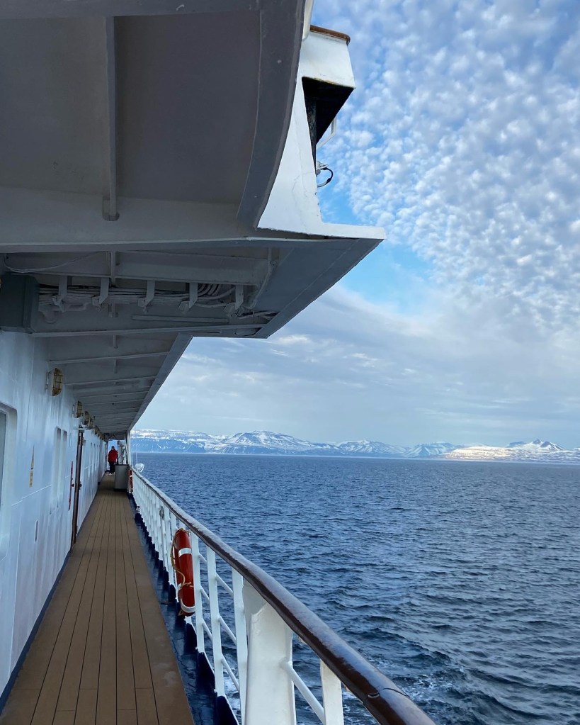 Abendessen in fröhlicher Runde mit den Hannoveranern und den holländischen Forschern, danach geht es an Deck 5 in den Jakuzzi. Es ist 21.00h. Die Sonne scheint auf schneebedeckte Berge, während wir im Hot Tub mit Weisswein anstossen. Das Leben ist schön.