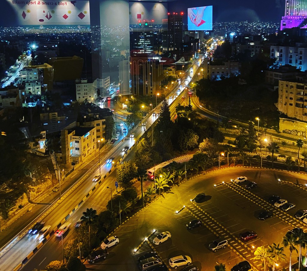 Bin mit der turkmenischen Fussballnationalmannschaft im Fahrstuhl gefahren. Und mit den Palästinensern. Schnelle Anfreundung. Gisela, 83 Jahre, habe ich in der Bar gelassen. Karla war auf ner Flussfahrt in Indien, die Vögel haben im Speiseraum in der Deckenleuchte genistet Also in Indien. Nicht hier. Das Buffet beim Dinner war sehr gut. Hummus geht immer. Die Reiseleitung hat sich rückversichert, dass ich als Vegetarier (melde mich immer als Vegetarier an) etwas zu essen gefunden habe. Hab ich. Das ist der Blick aus dem 13ten Stock auf Amman. Jetzt gehe ich in mein wunderbares Boxspringbett. Und morgen geht es nach Gerasa.