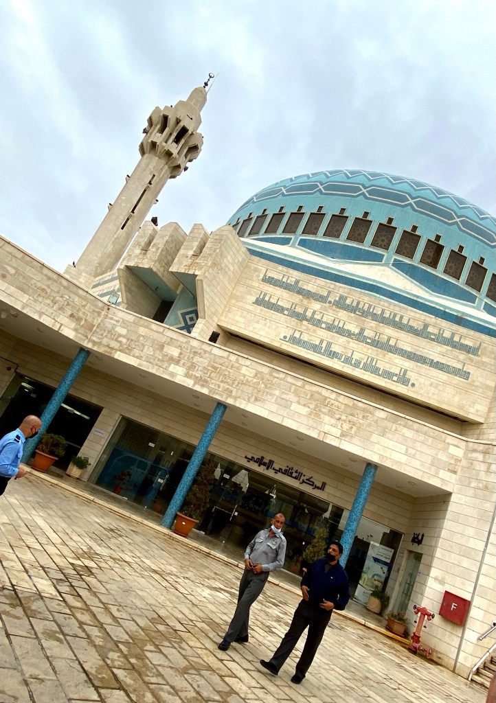 Die König-Abdullah-Moschee hat einen dicken weichen Teppich mit Sternchenmuster, das uns die Reiseleitung erklärt. Da ich mich nicht für Religion interessiere, wandere ich ein wenig unter der riesigen Kuppel umher und spüre die Füsse im Teppich versinken, die nette Aufsicht bietet mir ein Glas Wasser an (später bekomme ich einen indirekten Rüffel, weil ich nicht beim Teppichmustervortrag aufgepasst habe).