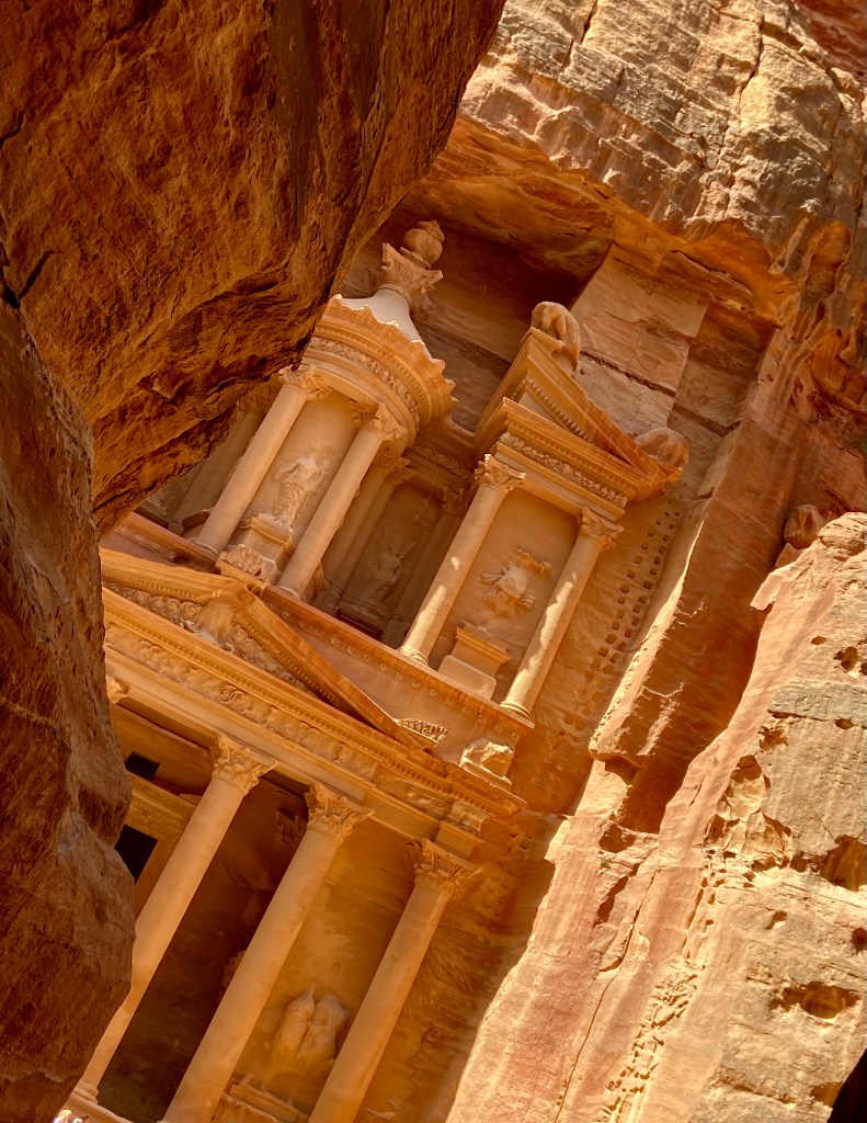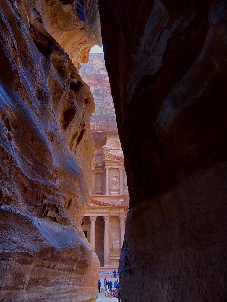 Das tut nix für meine innere Balance, und ausserdem komme ich hier selbst zurecht, bin ich schon gestern Nacht bis zur Schatzkammer vorgedrungen. Auch bei Tageslicht ist es beeindruckend: die Felsen ragen bis weit in den Himmel, winden sich den Weg entlang, weiten sich, verengen sich, wechseln die Farbe, sind rauh und mal glatt, lassen ab und an den Himmel wie zufällig blau aufleuchten, und geben nach zwei Kilometer und einer letzten Wende den Blick auf die Schatzkammer frei. Ich fühle mich hier wohl, fast heimisch, am Fusse des riesigen Schatzhauses, das ein Jahrhundert v.Chr. erbaut wurde. Ich spaziere weiter, überall in den Felsen tauchen weitere Grabstätten auf, ein römisches Theater, Tempel und Säulen.