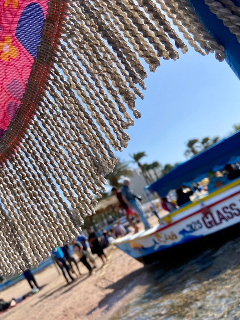 Der Wind treibt mir die Tränen in die Augen, ebenso die Dankbarkeit, jetzt hier sein zu dürfen, aber auch das Mitgefühl für Mary @mairose42 , Marie @lesetiefe und all die anderen, die gerade im Krankenhaus liegen und für weitere Zeit und schöne Momente kämpfen. Mich berührt das sehr, erlebe ich doch gerade schöne Momente. Im Wind auf dem Roten Meer, hier auf dem kleinen Glasbodenboot, verspüre ich sogar etwas von der verloren gegangenen Leichtigkeit, wir lachen, hören laut Musik und winken zu den anderen Booten rüber.