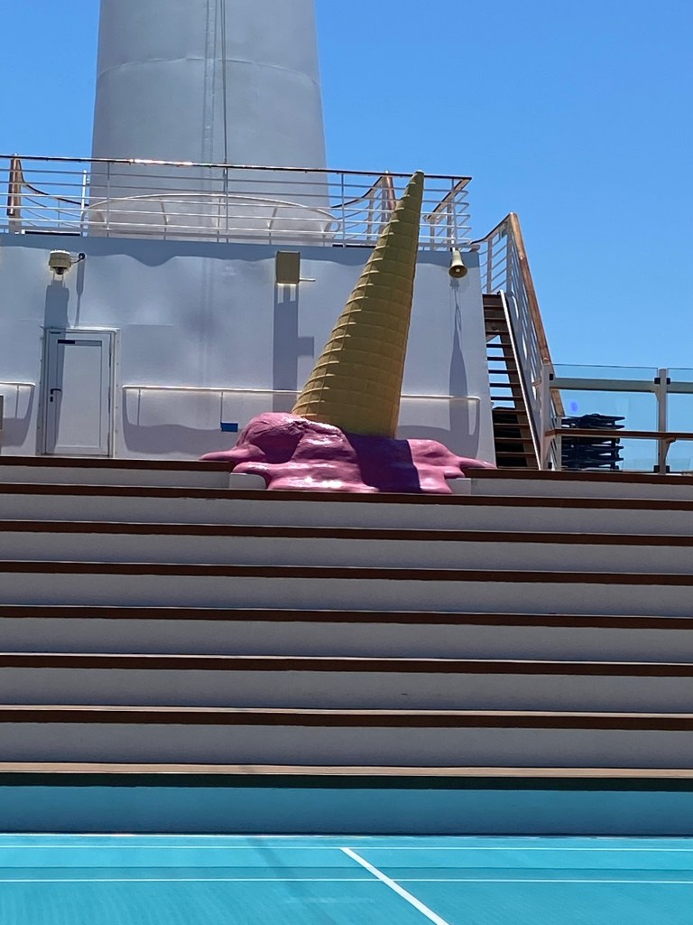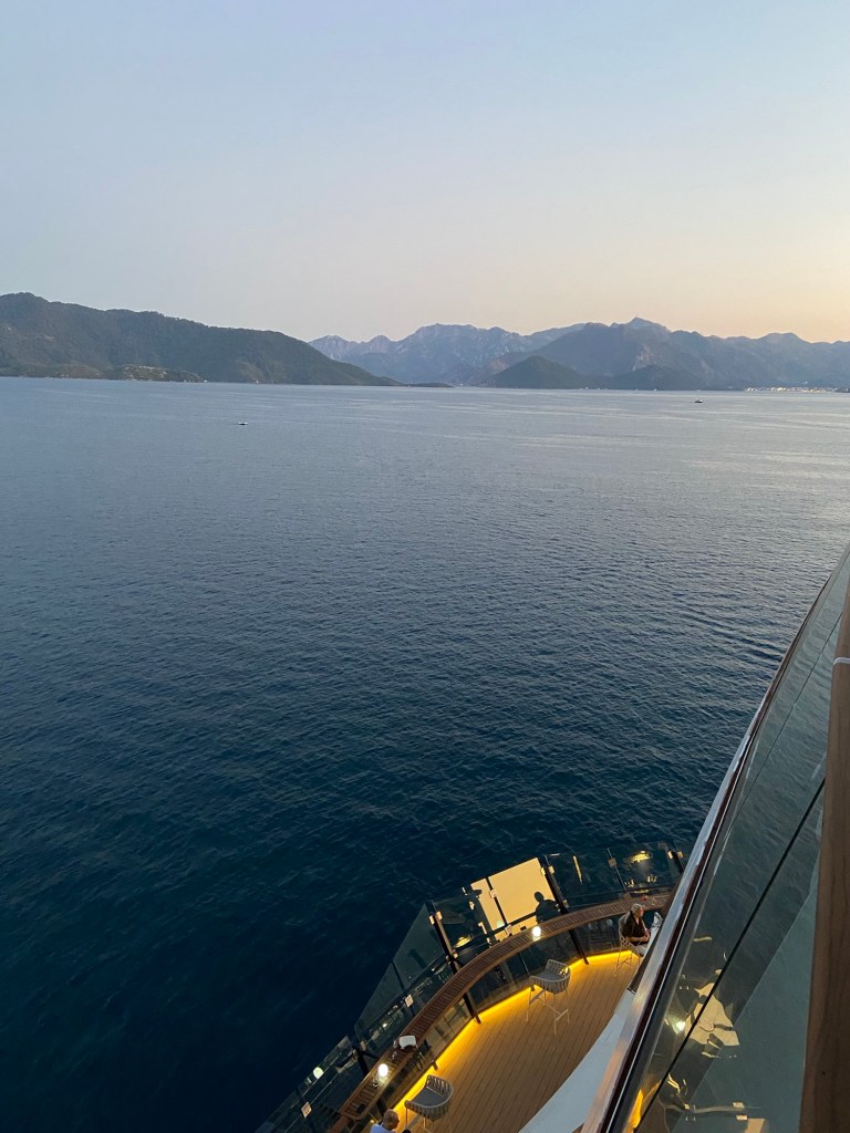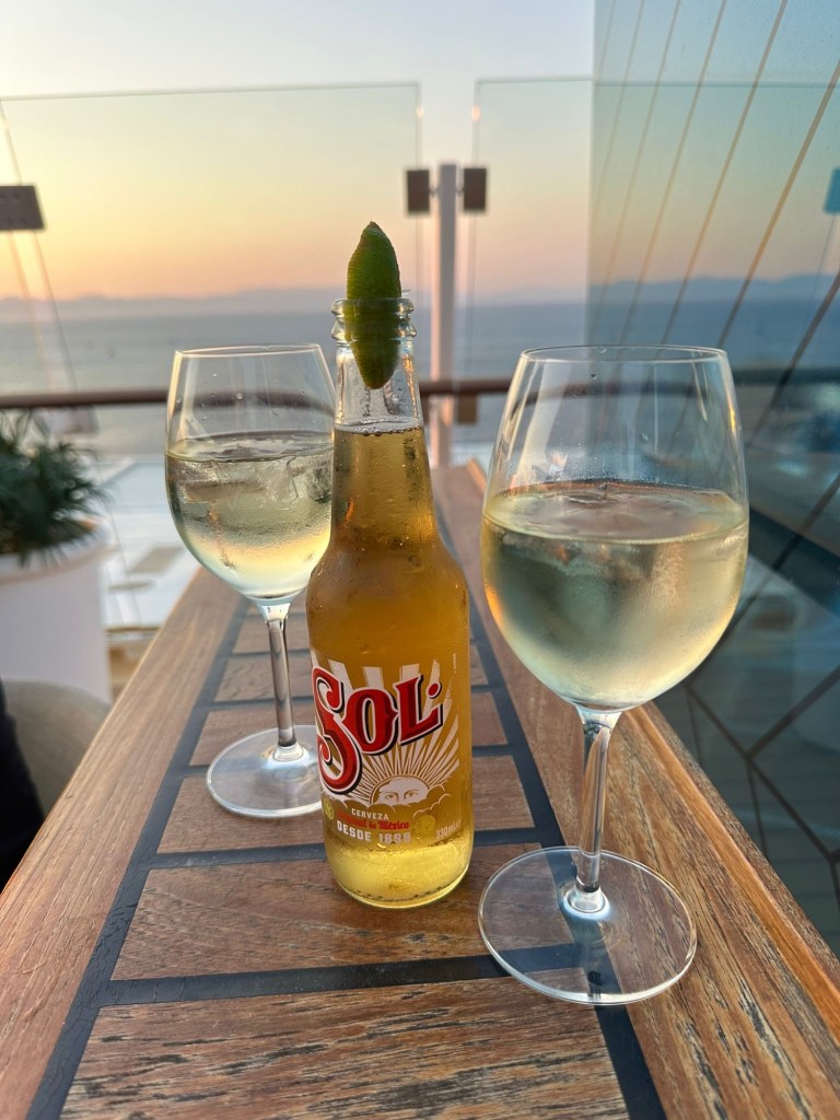 Sunset in der Bar auf Deck 14. Das Auslaufen verzögert sich, Kabine 6184 wird ausgerufen – wir spekulieren, was da wohl los sein mag…ich baue auf meinen kommunikativen Schwimmfreund M., den ich morgen um 7.00h wieder im Pool treffe.