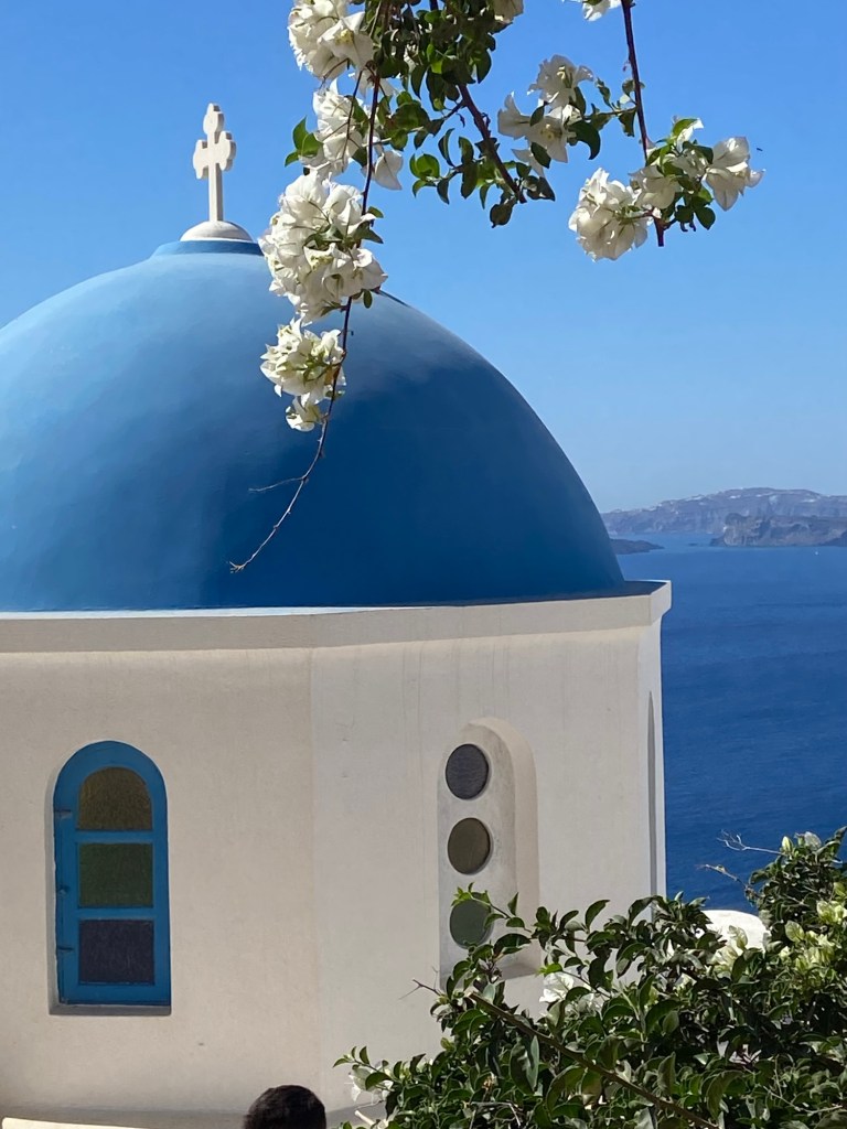 - entspannt mit dem Freund Kaffee Frappé trinken, mit Blick auf weisse Häuser und blaue Kuppeln.