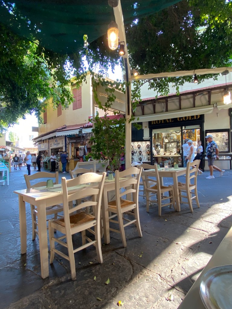 Auf Rhodos legen wir recht spät an; genug Zeit, um morgens wieder zu schwimmen bzw. zu joggen und danach in Ruhe zu frühstücken. Um kurz nach 11h gehen wir an Land. Es ist sonnig, heiss und recht voll in der hübschen Altstadt, ich kaufe einen Ledergürtel (zu spät fällt mir ein, dass ich keine Hosen mit Gürtelschlaufen besitze), der Freund kauft sich ein Armband, wir bummeln herum und wieder zum Schiff.